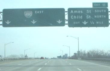 All WB, third photo courtesy Doug Kerr. This is the last state-name shield in the WB direction, and there's also one in the EB direction west of the city. Click on the last photo to see the pre-construction version with the I-490 shield, courtesy Doug Kerr.