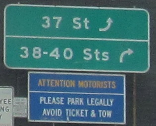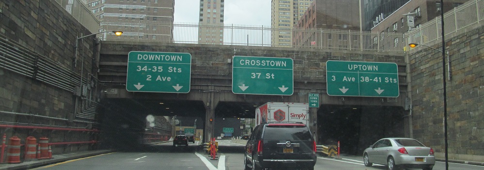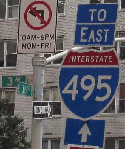 I-495, according to some, begins here at the entrance to the Queens-Midtown Tunnel, while others hold that it's NY 495 until I-278. Historically, the latter has been true, but the former is probably true now. I'm not getting in the fight between NYSDOT and FHWA, because there are other anomalies here. For example, the stretch from I-278 to I-678 is technically NY 495, and everything east of I-295 started out as NY 495 before being upgraded. These signs are on 1st Ave. NB and 2nd Ave. SB respectively, and the one atop the page is on 34th St. WB.