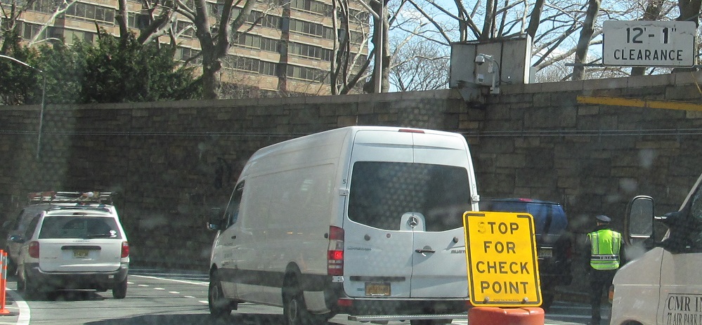 The WB roadway exiting the tunnel quickly widens and splits apart in its trench. The Downtown branch was intended to connect across town (submerged, but with an elevated alternative once audaciously proposed) to the Lincoln Tunnel, hence the latter's numbering as NJ-NY 495 and previously I-495 in NJ. The gore between Crosstown and Uptown branches needs a little work; the top arrow should be more of a squiggle, since this implies you have to turn right and then curve left, conflicting with the bottom arrow that tells you to go straight and curve right.
