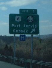 I-84 dips very close to the NJ/PA/NY tri-point at Exit 1 (see the link at the bottom of this page), thus the NJ-spec 23 signage. In fact, the interchange is only a couple hundred feet past the border, which is Orange County 15 but signed as TO 23 and TO US 6 for the most part. Sussex should probably have an NJ tacked on, and the NY 23 shield should be burned (or donated to the actual NY 23). To burn it, click on the second photo and revisit the past, courtesy Doug Kerr.