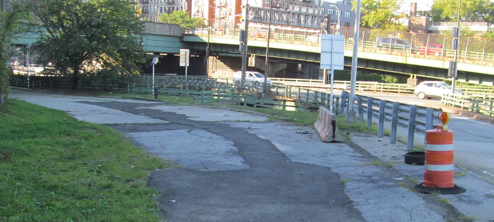 The surface detour for the bridge entrance takes traffic along 179th St. or 181st St. EB (first photo is the latter) to Amsterdam Ave. NB and then to the Exit 1B onramp at the Harlem River Drive. Bubble shields are bad enough, but this is a two-digit route.