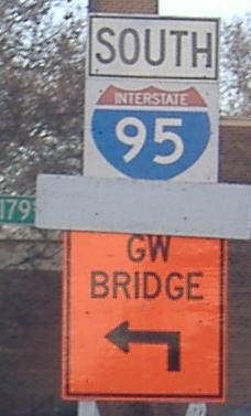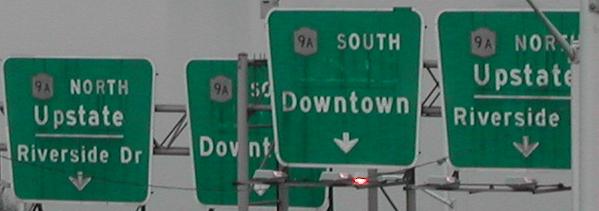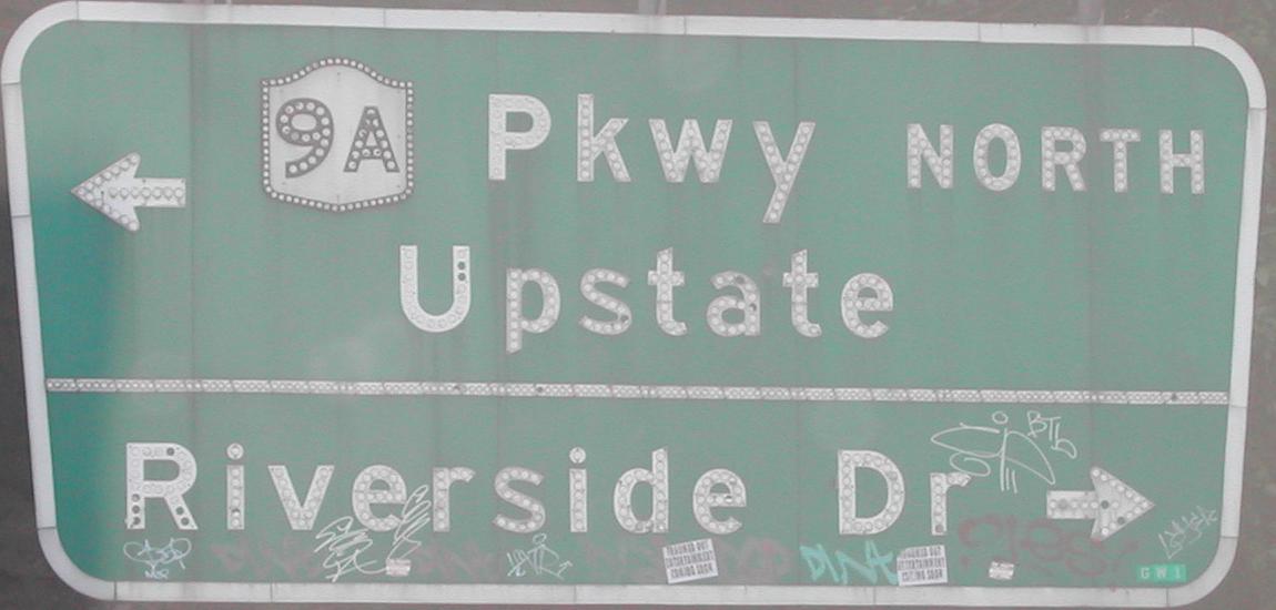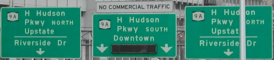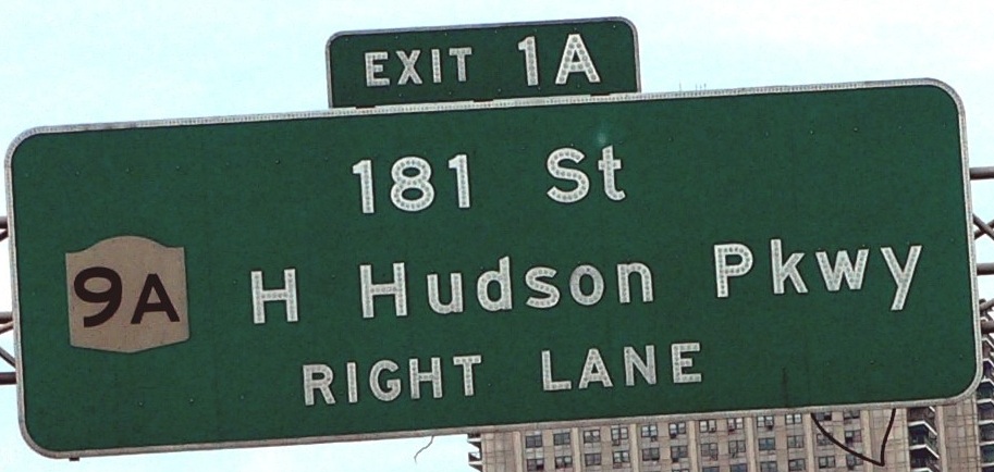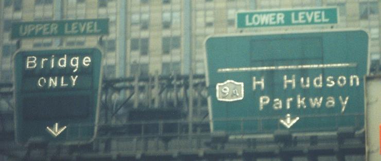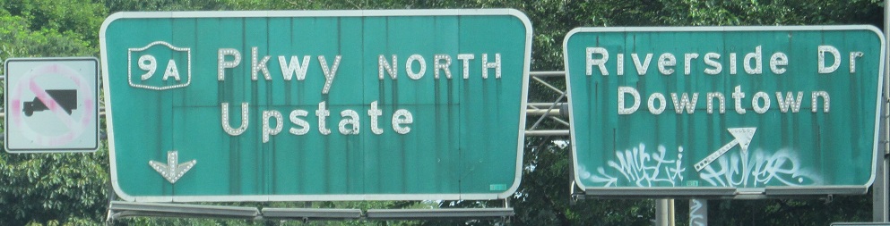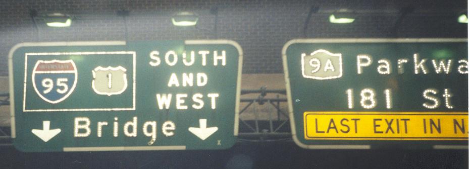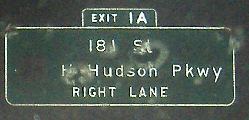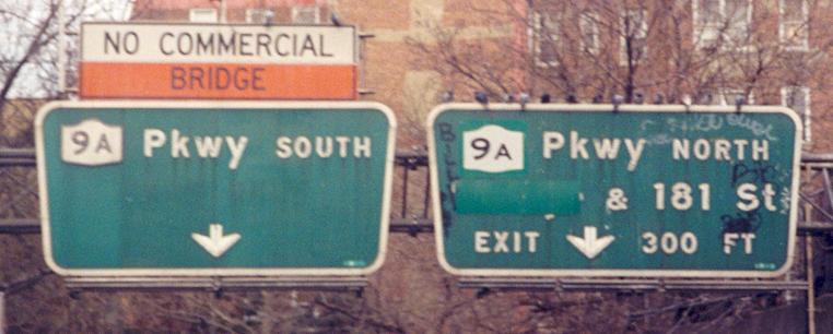 The first BGS is on that lower level exit, and if you take the ramp from either level and head toward NY 9A NB, they merge and you come to Riverside Drive, a traffic light, and the second BGS. These both are Port Authority originals from WAY back in the day. Look below at the old 95/1/9A assembly, and those are from the same era. I'm guessing '50's or '60's. To view the first sign larger courtesy John Krakoff or to unblur the second sign thanks to HNTB Corporation, you can just click on either one.
