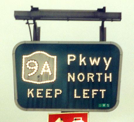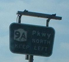 Courtesy John Krakoff, these SB Exit 1A ramp signs are gone now. The word "Bridge" has been removed from the Pkwy. NB signs, perhaps because traffic just had its chance to get on the Bridge, although it's entirely possible there was once a traffic configuration that didn't let local traffic use the entrance when these signs were somewhat newer. The other thing covered is old NB shields like the one for 9A SB, now covered by droopy, non-button copy monstrosities.