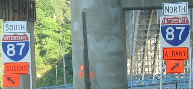 Mercifully temporary signs on the Exit 3 (ex-1C) ramp after it's twirled around in a 180, and the ramp to I-87 NB passing under the Washington Bridge. The "No Turn on Red" sign is humorously misplaced here, as it really ought to be on each level of the George Washington Bridge where one first enters the city.