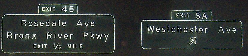 The Trans-Manhattan Expressway recently regressed from mileage-based exit numbering to sequential. Thus what was once 1C, as in these pictures, is now Exit 3. The problem with this is that the Cross Bronx has just started renumbering (and seems to have stalled out), so that the current exit progression is 1-2-3-2A. Problem. Even worse is the fact that signs like this one still remained for awhile, so that half the signage pointed you to Exit 3, and half still showed Exit 1C. Also notice that BGS's on this stretch of I-95 were originally unnumbered (freeway opened in 1964). The 1C in the photo above was tacked on, and there is no 2A on the BGS below. Finally, note that the I-95 shield has fallen off by summer 2005 - maybe there will be new signs here next year.
