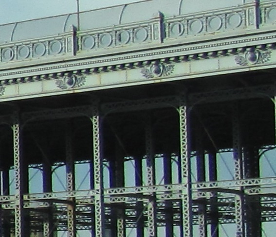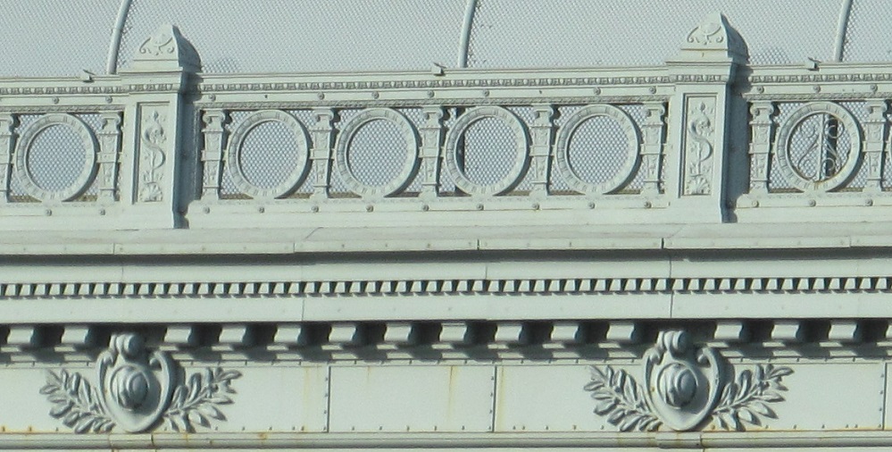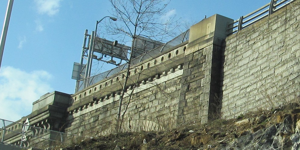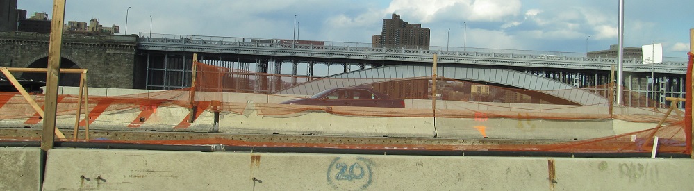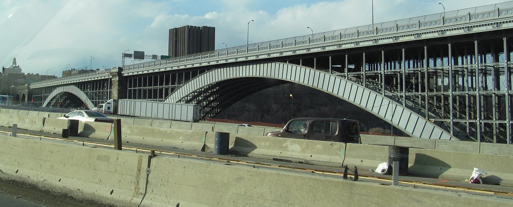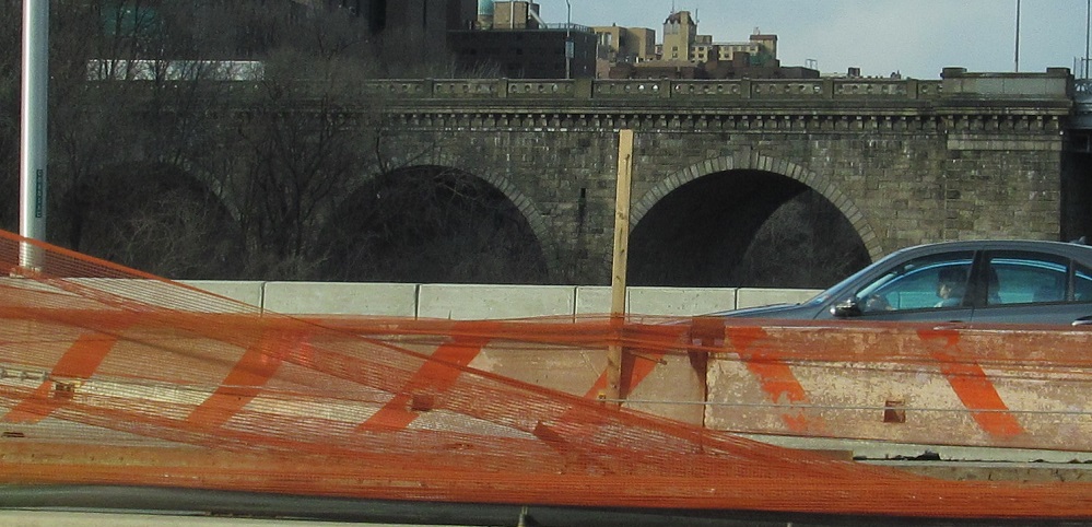 Here's what that construction looked like in March 2013, part of a deck reconstruction on the Alexander Hamilton Bridge that ultimately added some merge space for the I-87 onramp. I offer plenty of views of the parallel Washington Bridge, starting at Undercliff Ave., along with the High Bridge Water Tower that marks the west end of the High Bridge aqueduct. The last photo is the northern ramp abutment for the I-95 NB-Washington Bridge EB ramp, new superstructure (as of 2013) sitting on original brickface.