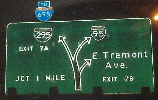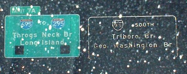 Five gantries heading WB on the Bruckner/SB on I-95, approaching I-695, and the final ancient ground sign at that interchange which is bound to be replaced any day now (and needs it badly). Until April 2008, technically (according to the FHWA), the short I-695 (labeled by NYSDOT) was SPUR I-295, since I-295 runs northwest smack into the Bruckner Interchange. However, NYSDOT ignored the official Interstate designation and used the last spare even x95, and pestered the FHWA until April 2008 when finally they relented and recognized I-695 as a real route. Even NYSDOT's I-695 designation was a change from the original (which was probably just considered a wye of I-295), so older signage shows only I-295, while new signage sports the 695 shields. Notice the old diagrammatic sign (first photo), as well as the tacked-on I-695 shield.