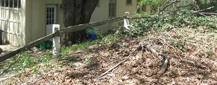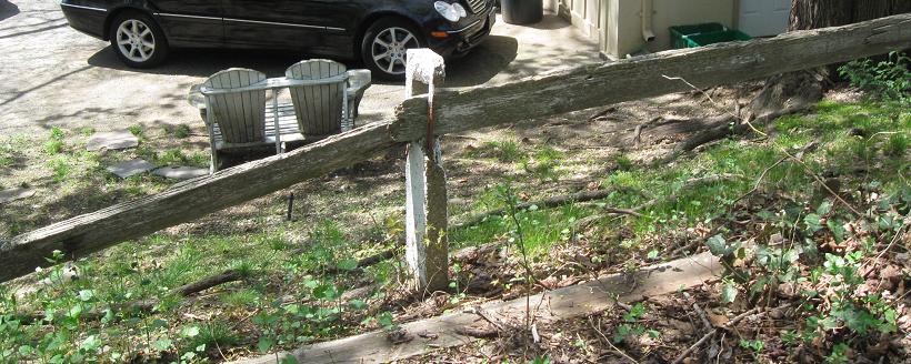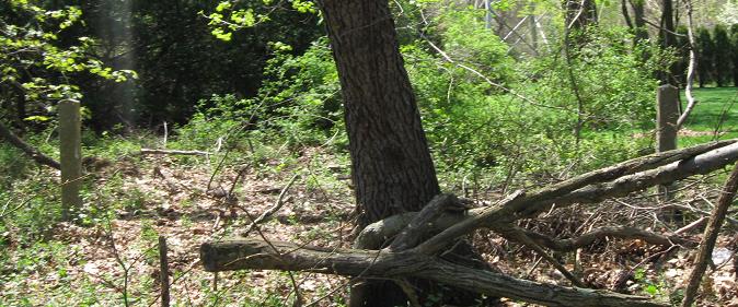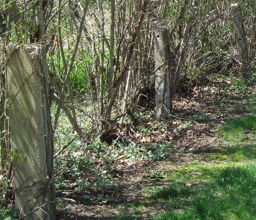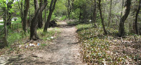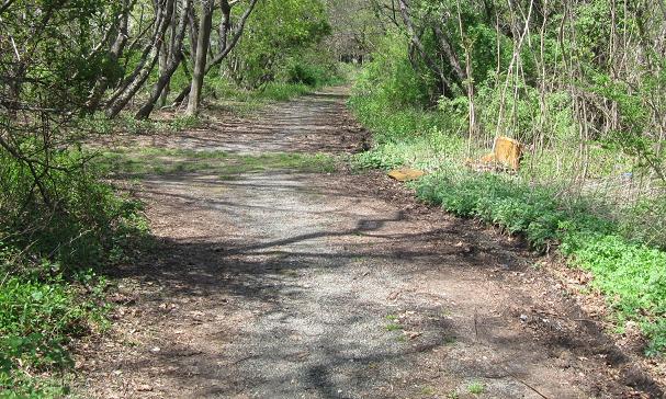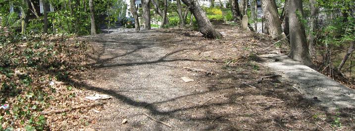 The Parkway may be more traceable than I give it credit for. South of Westbury Ave., it heads around the backs of some industrial buildings and follows the fence line to the railroad tracks. I went to the end of E. 2nd St. and didn't see anything worth photographing, but you may have better results by heading south from Westbury Ave. (east of Bruce Terrace). South of the railroad, the Parkway right of way is now apartment buildings conveniently located on Vanderbilt Drive. The right of way runs through more backyards and heads south until Clinton Rd., where it crosses just north of Vanderbilt Ct. You can't park on Vanderbilt Ct., and even if you could, you may not be able to get to the Parkway alignment. Head down to Stewart Ave., turn onto Raymond Ct., and park by the dead end. The Parkway continues left and right from the end, but most of the interesting stuff is to the left.