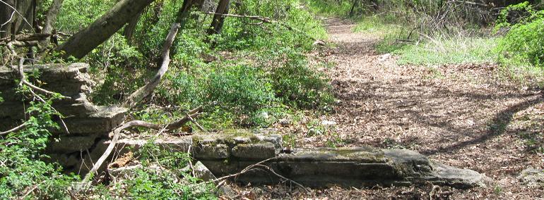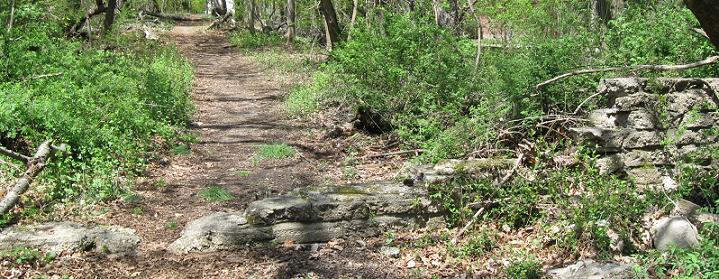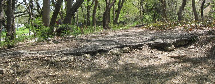 As I approach Clinton Rd., there are a couple of guiderail posts and then a stone wall crossing the Parkway. Because stone walls generally don't cross freeways, I presume it was added later. Through pure fortuity, the wall has been worn down over the years along the path to be followed - and yet it's less than 70 years old? Perhaps this is a case of shoddy craftsmanship.