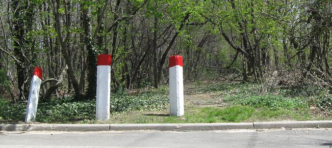 Heading back east, across the stone wall, up to Raymond Ct., which has more stone guiderail posts along the north (Parkway westbound), and a look east at the short right of way there. I did not walk east, but I do not see how it could be more interesting than what I found by walking all the way west.