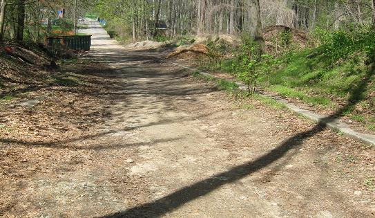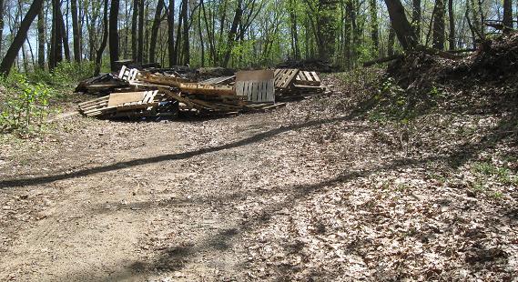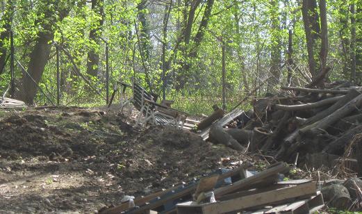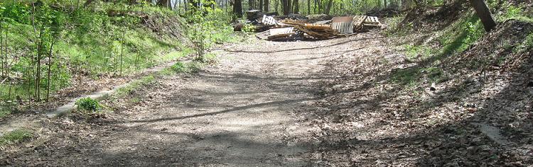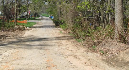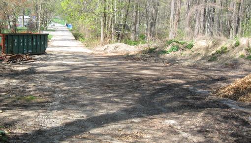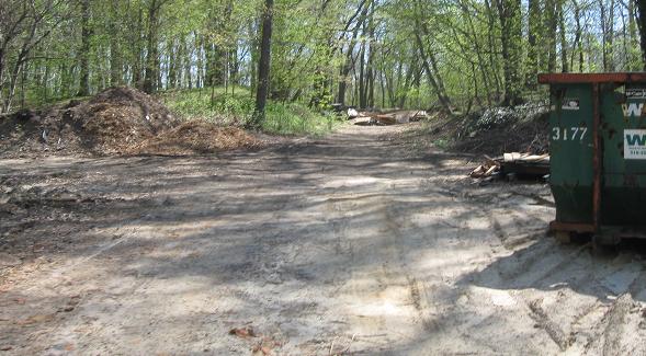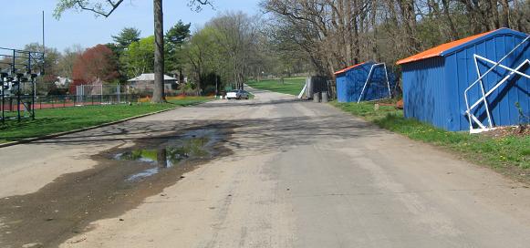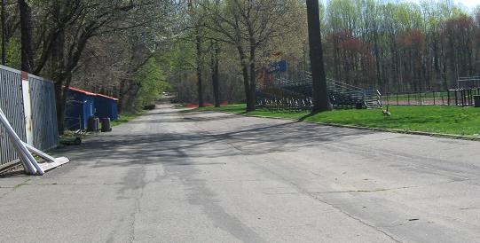Walking east from the Tanners Rd. area past the track and soccer field to the end of pavement, where the original curbs are once again visible after having been hidden in the vicinity of the trash bins. There's more refuse piled up at the end of the road that ought to be cleared out, and the right of way continues through the trees to Northern State Parkway.