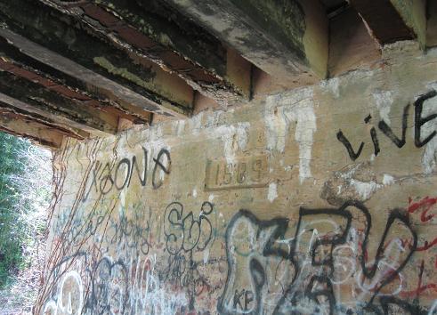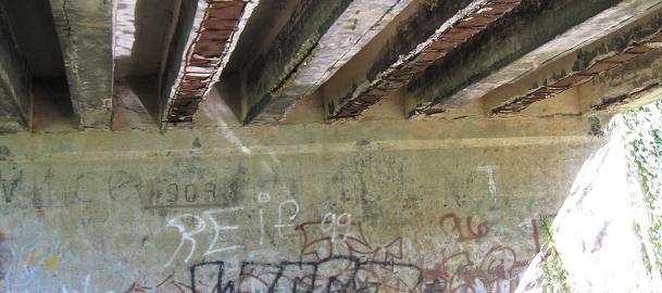 The southern and northern abutments of the Old Court House Road underpass. No one really uses the overpass anymore and it does not appear to have been rehabilitated, so it may not be standing all that much longer. You could cross the top of the bridge, at least on foot if not by car, by turning left from the eastern end of Executive Dr.