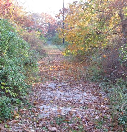 To the right (west), a path leads through the trees. And it's paved. This is the eastern end of the Maxess Rd. section of the Parkway.