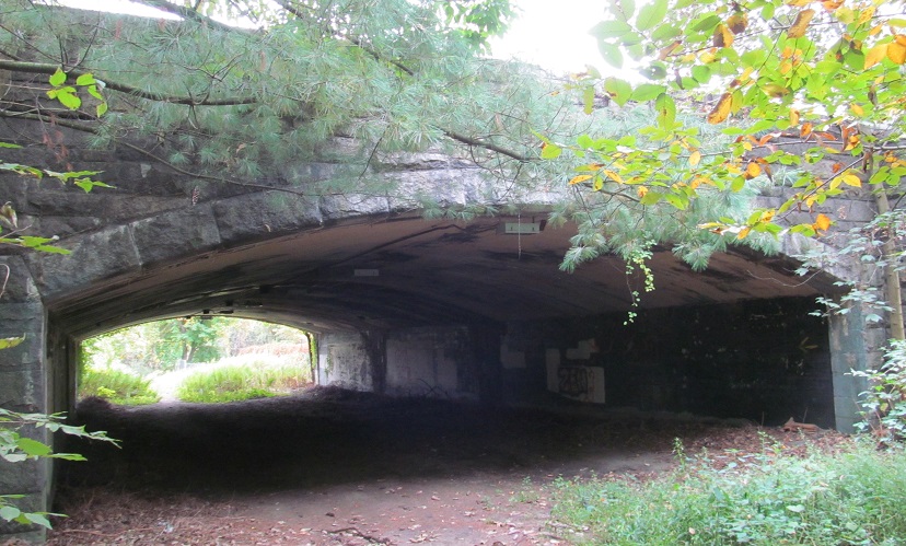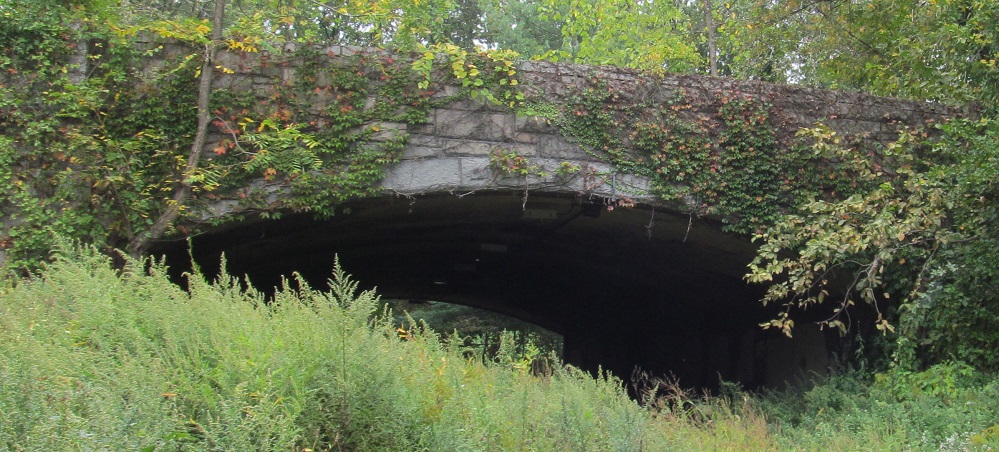 I believe I've captured all three arches of a bridge over a golf course path by the north end of the Parkway. The small center arch is the actual path, while the larger arches on either side go unused. Of course, that wasn't always the case. The western arch (2nd photo) overcrossed the New York and Putnam Railroad, while the eastern arch (1st photo) was for a path that crossed the railroad on the south side of the Mosholu, then peeled off and looped under itself and the Parkway. You got me why it couldn't just connect to the golf course path.