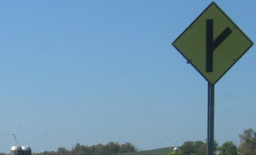 Nothing much happens between there and the southern end at NY 170, which is a wye but signed like a split to the right. That's because the intuitive movement is to continue southbound, which is left. The windmill is to the right, and the NY 170 shield is right in the middle of the wye.