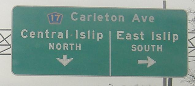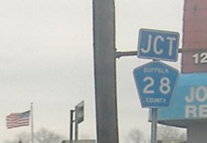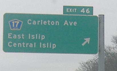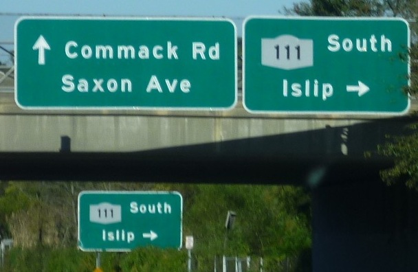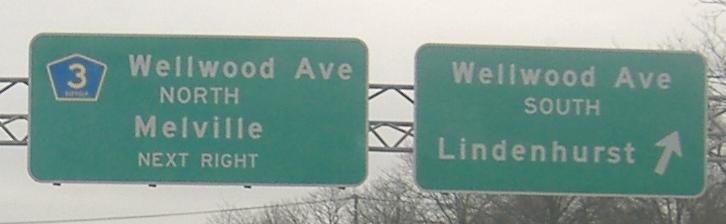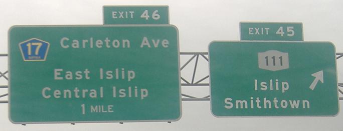 Eastbound in the mixed signal-interchange area before the freeway begins, first photo at CR 47 courtesy Mike Byrnes. All of the shields are typical on Long Island; compare the regular Suffolk CR shield to the newer style on the BGS's. It's growing on me to remove the word "COUNTY" from BGS shields in order to maximize room for the number. I would rather see the county name above the number for consistency with the standalone shields, and narrower shields for numbers as low as 3.