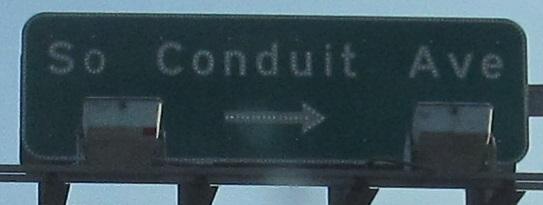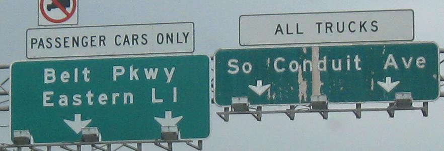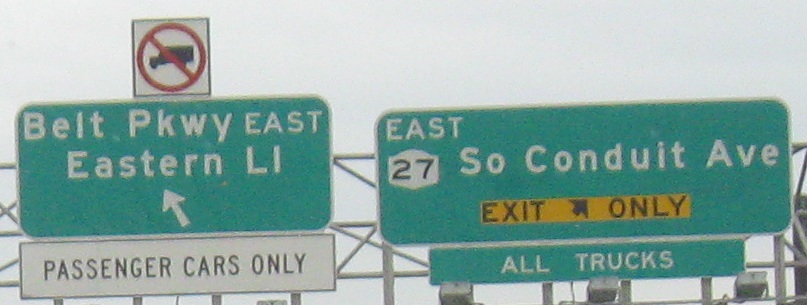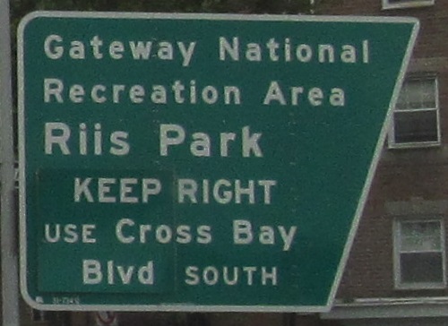 EB on Conduit Blvd. with a very wide median that is clear for over a mile. It was supposed to hold I-78, the Bushwick Expressway, but even though that concept has long died, nothing happens in the median until NY 27 dips down, ready to begin the Nassau Expressway (NY 878). What could have been under the patch on this sign? Declan Hughes informs me it's a flip panel that says CLOSED for the rare times a park would be closed.