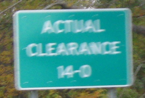 WB at I-87. Everything is fine except the lack of units on the first sign - okay, and these should be black on yellow. New York posts Actual Clearances because their policy is otherwise to allow 6" above the posted height just in case a trucker swears his rig is 14' even and not 14' 2". So in this case, that trucker would be out of luck.