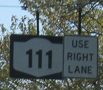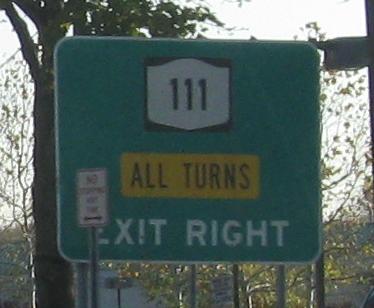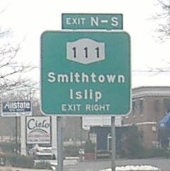 Courtesy Doug Kerr, this was once the WB sign at the same intersection. In addition to also having the black background (proving these signs were made incorrectly from the start), it refers to a long-dead route that was replaced by I-83 and US 15. Those aren't anywhere near here, so obviously it was an error, and that's why there are NY 111 shields there now.