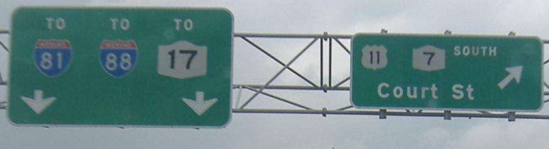 NY 363 has an identity crisis; its primary purpose seems to be to tell NY 7 and NY 434 traffic how to get to each other. Back when NY 17 followed US 11 through Binghamton and came down what is now NY 434 (in the days when the Quickway was not complemented by the Southern Tier Expressway), 363 would have been a very useful downtown bypass for 17 through traffic. The old SB button copy signs are gone, by the way.