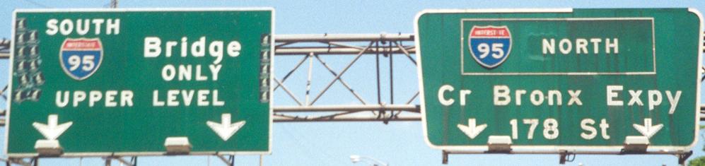 Old and now-gone button copy signs from where the NY 9A Exit 14 ramps come together, courtesy John Krakoff. The ramp from NY 9A SB turned onto Riverside Drive SB and then looped into the left side of the ramps, while NB traffic pours in on the right. The many lanes this creates then all split even more confusingly, with multiple opportunities to head to the same destinations.