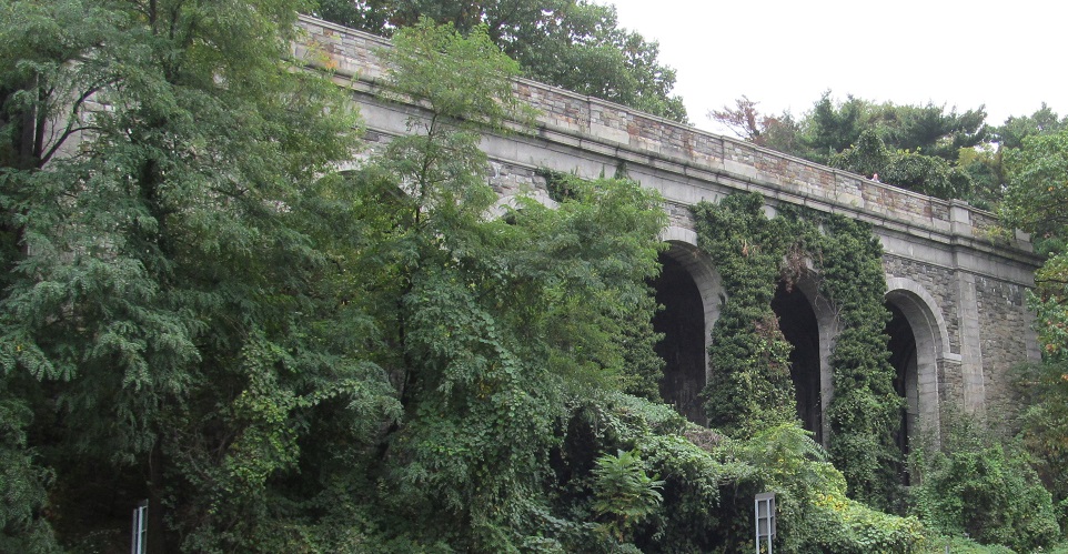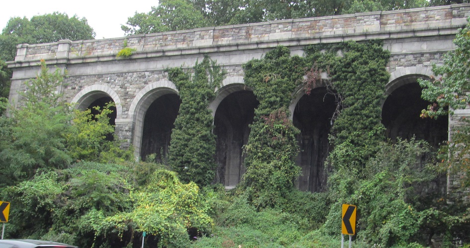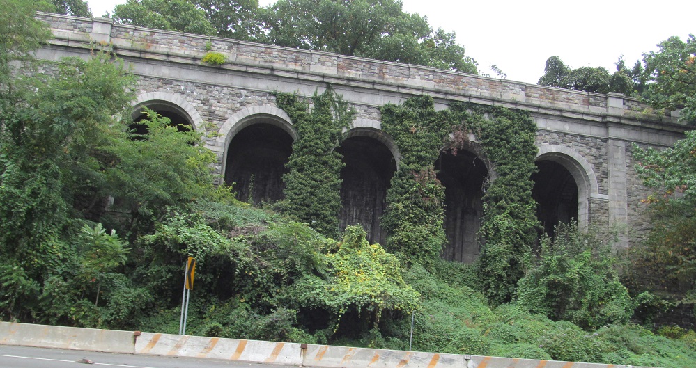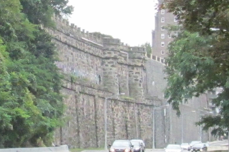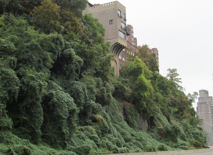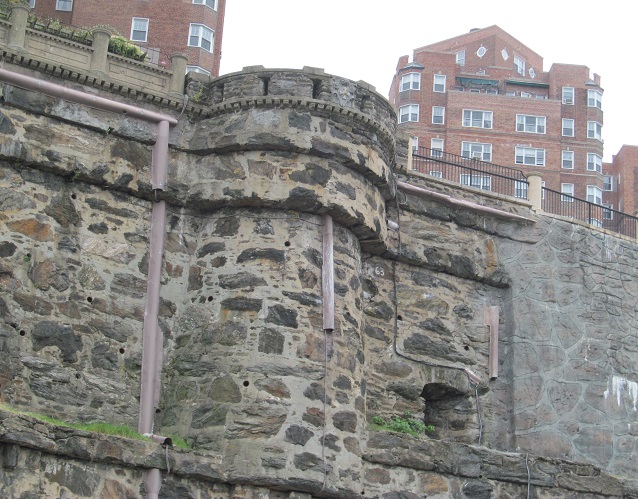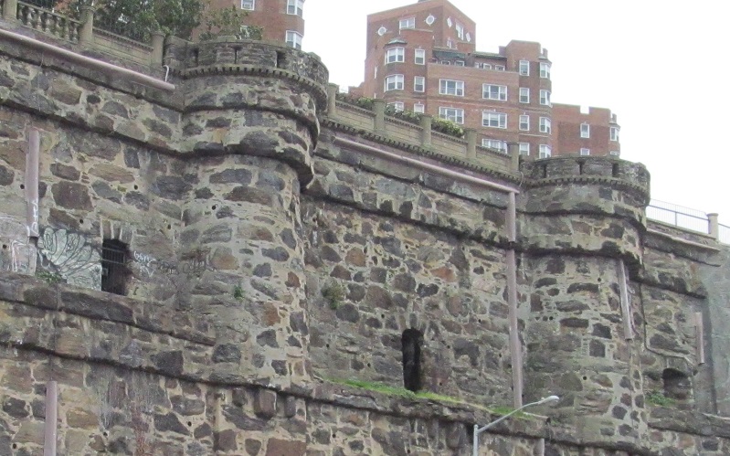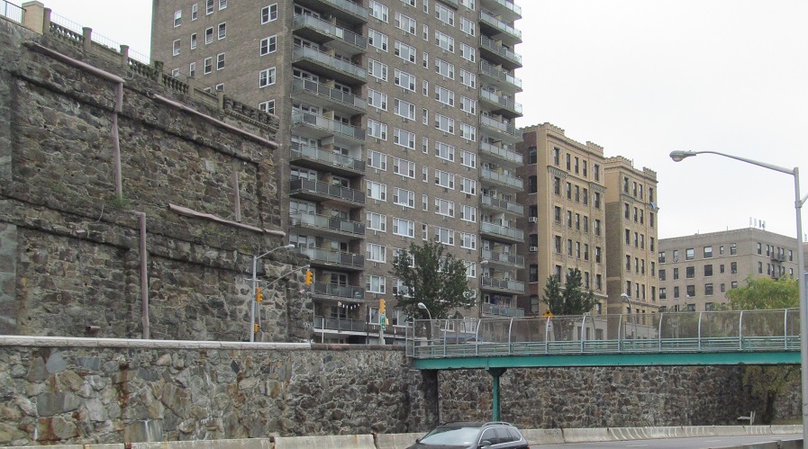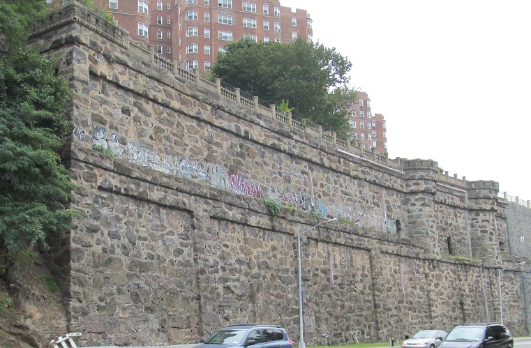 From 185th St. to 182nd St., this is the 100-year old wall of Charles Paterno's castle. He was a landscape developer who built a castle over 11 years from 1905-1916 with several riverfront acres, then moved out and had the whole thing demolished in 1938 to build the current Castle Village towers. Building a castle just to abandon it? That's money. The original wall now holds up the towers from the railroad and parkway below, although you can see in the 4th photo that there's a newer portion of the wall. That's where it collapsed in 2005 and had to be rebuilt.