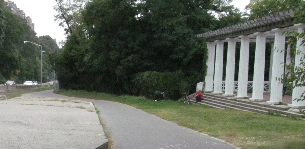 Entering this former NB pullout the wrong way, this was Inspiration Point, originally built as a lookout in 1925 but cut off by the parkway in the 1930s. It originally had a roof and lower level bathrooms, but if you can imagine what would happen to lower level bathrooms in Manhattan, they were wisely removed for the 1990s restoration that left this plaza. It's now accessible along the Hudson River Greenway.