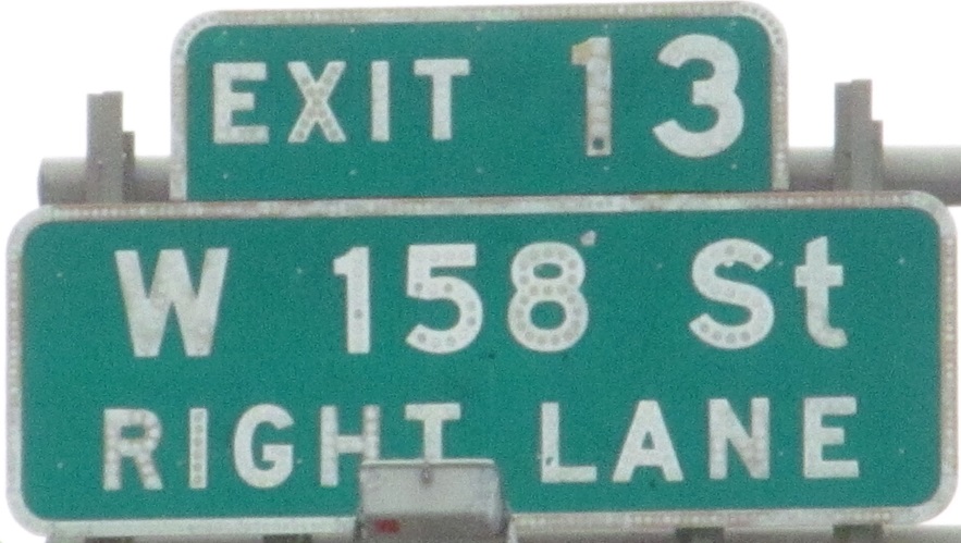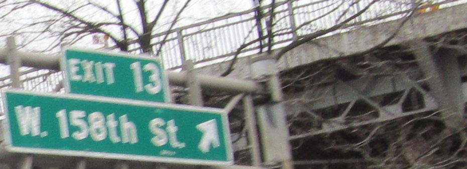 SB from the George Washington Bridge, with a few photos taken the day of Hurricane Irene (such as the leaning 95th St. overhead). Riverside Drive pops in on the left from time to time on whatever type of structure it can find. Arches seem to be preferred, though. The Exit 13 signs are all button copy and the second one appears to have been on the pole behind it originally. Exit 12 tries with its centered exit tab but fails. What should be Exit 11 but has no number takes a different tack, using the original signposts from the 1950's expressway boom.