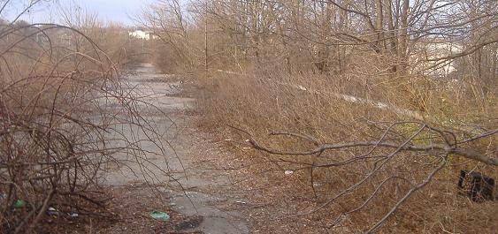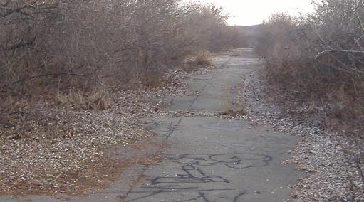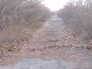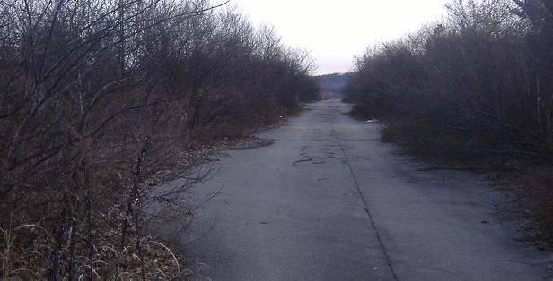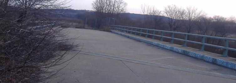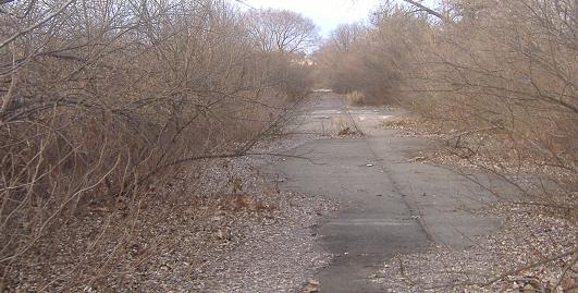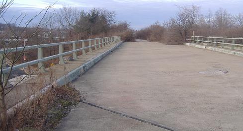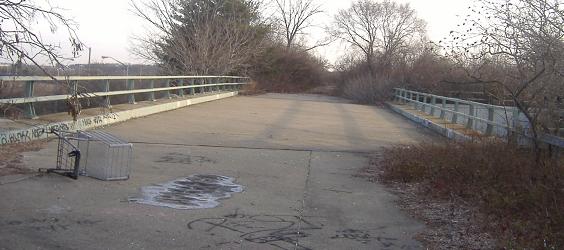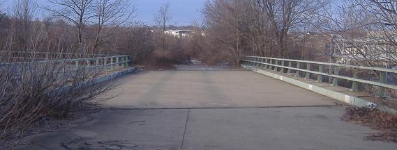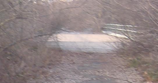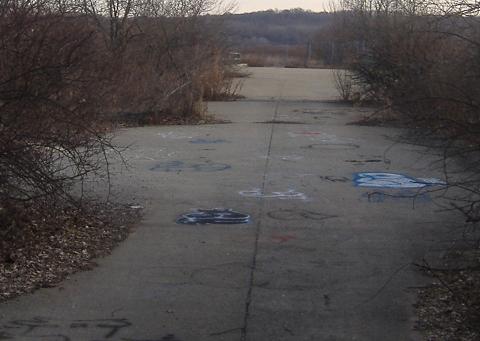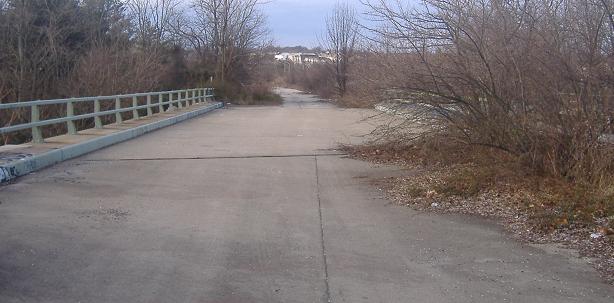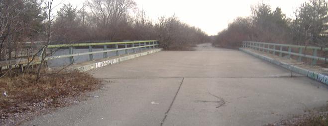 Now walking south in the NB lanes, retracing my steps back to where I started and using a zoom lens toward the end of the stub at the currently traveled road. In the next-to-last photo, a bit of original box girder guiderail peeks out of the trees to the left. I'm sure glad I didn't try to walk this in the summer.
