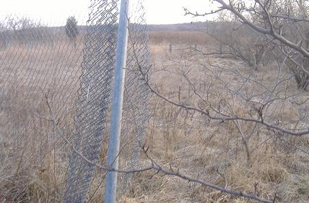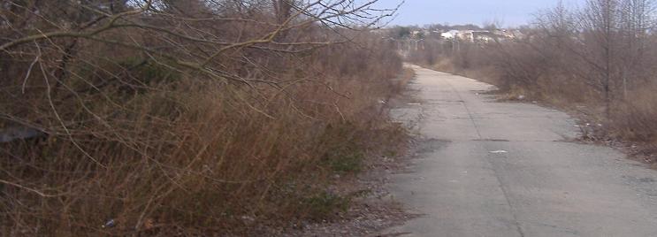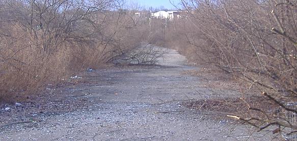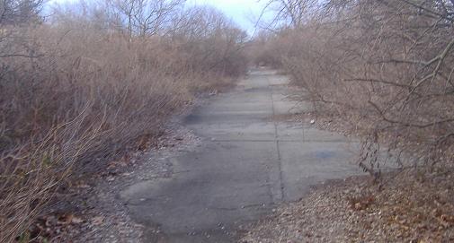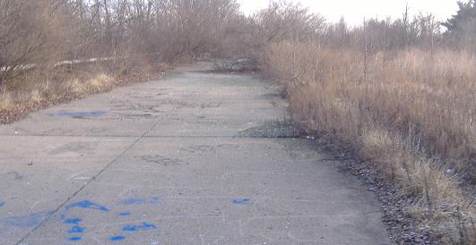 Walking north in the northbound ghost lanes, paved in concrete with an asphalt shoulder and slowly turning into grass. The first overpass is for Arthur Kill Rd., and the second diagonal one is for Richmond Ave. Through the fence that marks the end of pavement, the additional guiderail with posts marks the actual end of Richmond Pkwy. right-of-way.