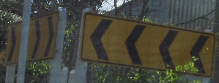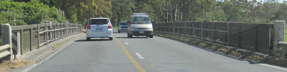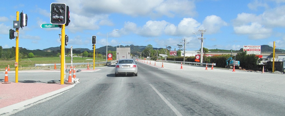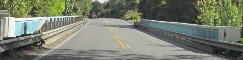 Heading north across the Otaika River. I noticed a trend of not cutting out work zone diamond signs. Laziness.