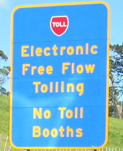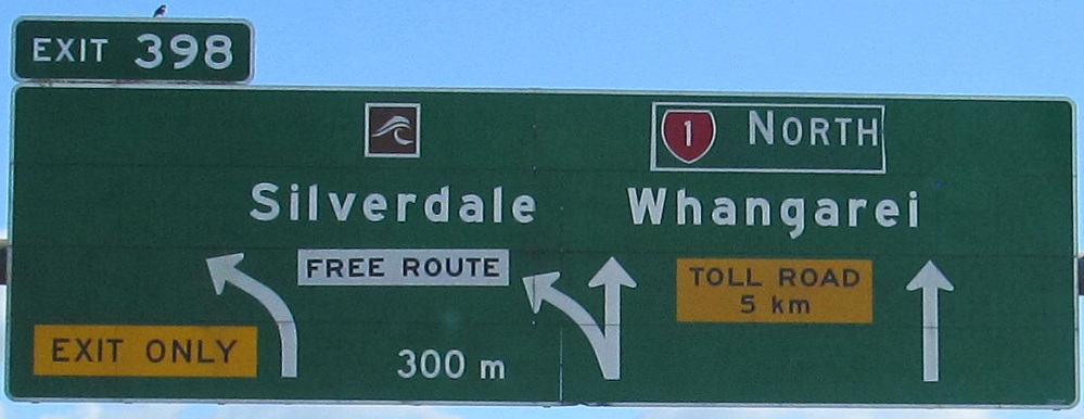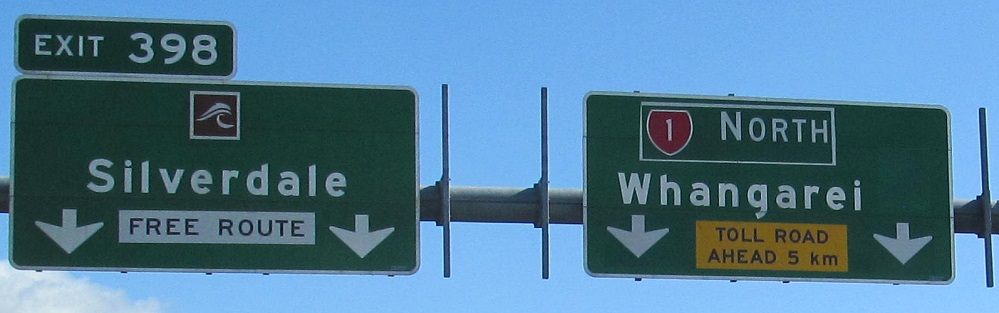 Not a fan of the yellow on blue toll scheme. The "Free Route" is the Hibiscus Coast Highway, old NZ 1 through Orewa. I'm not sure what to make of the little highway guide sign (New Zealand never includes the number) because that sign is still on the Exit 398 ramp, meaning that I just intentionally exited the highway, and the old route to continue north is to the right, not the left.