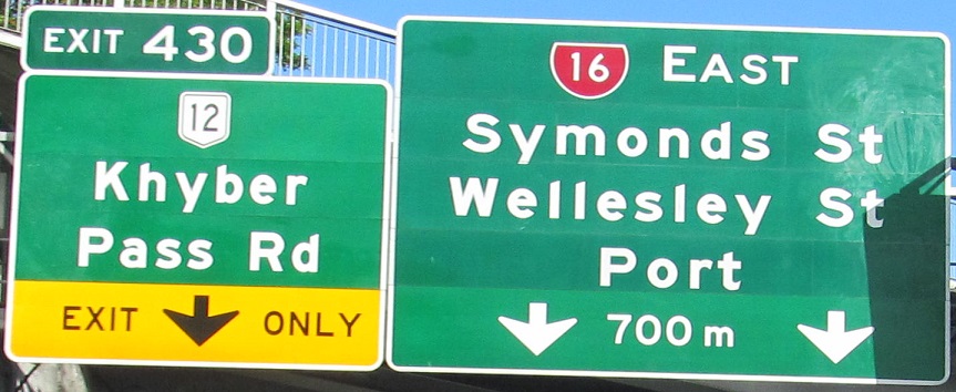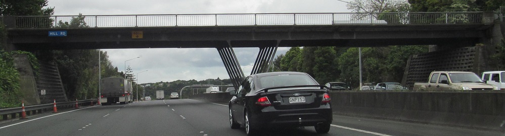 For some reason, NZ 1 is mileposted from north to south, so exit numbers count up as I enter Auckland. Hill Rd. is Exit 451, just inside the city limits of Auckland. The NZ 16 shields should be the same width as the 1s; I get the feeling New Zealand is starting to relax that rule.