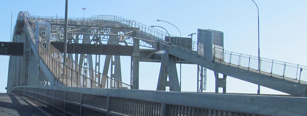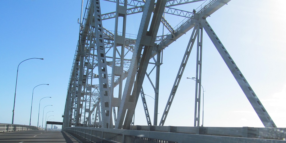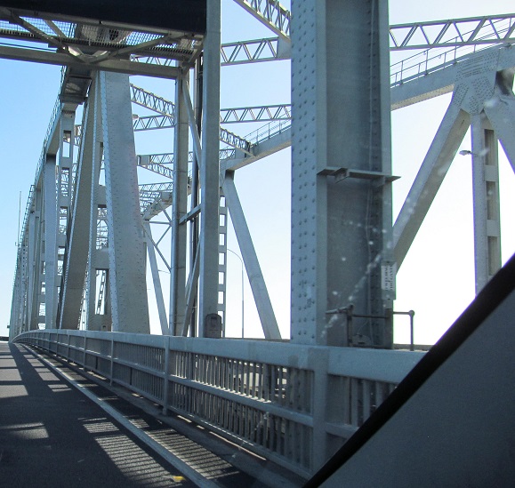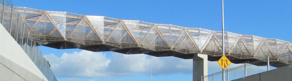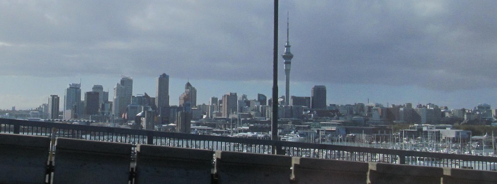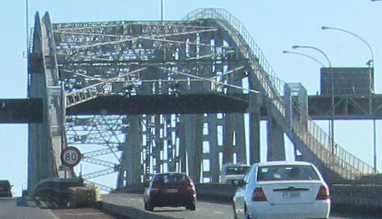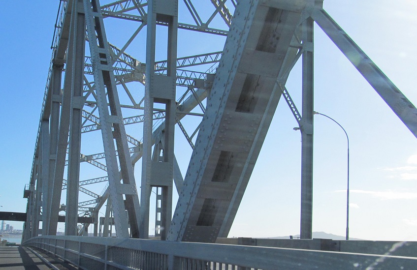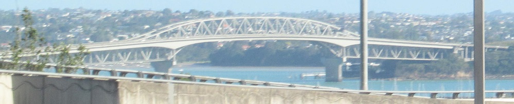 I opted for the side view as the lanes in both directions split around the original 4-lane truss. A balanced widening was chosen instead of a second parallel span. To the southeast, you can see the Sky Tower dominating the Auckland skyline.
