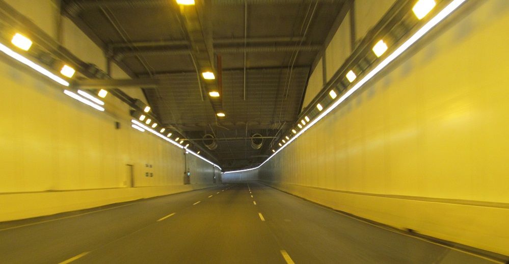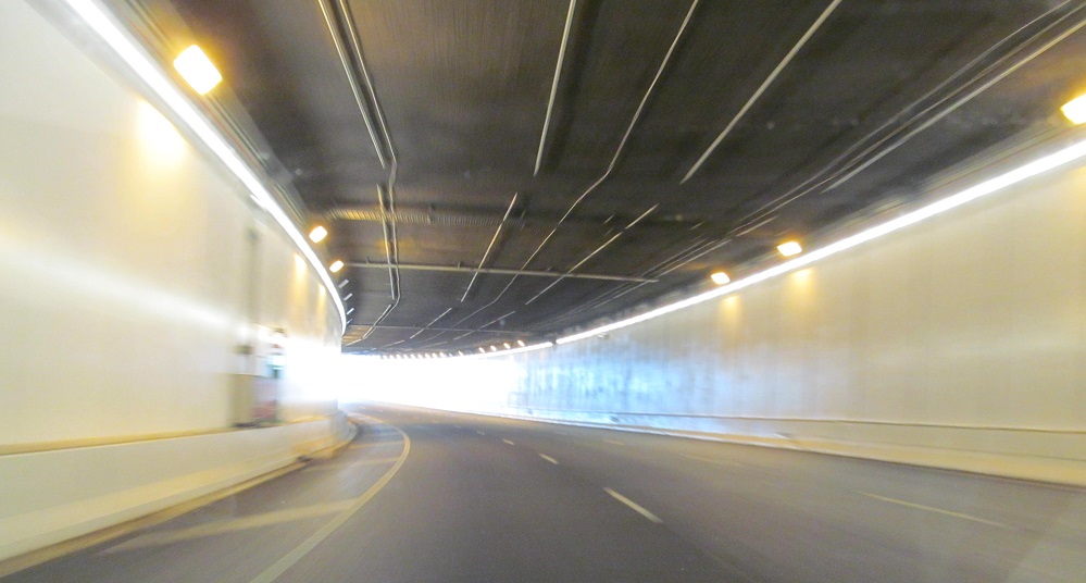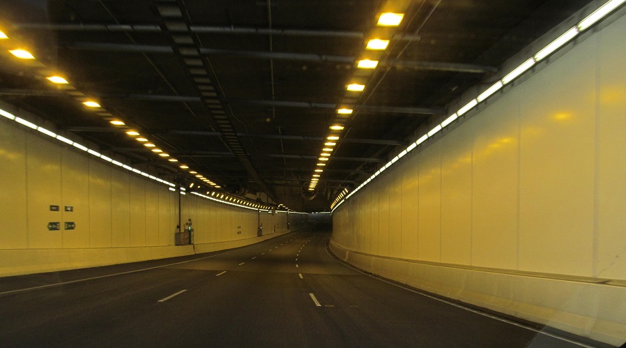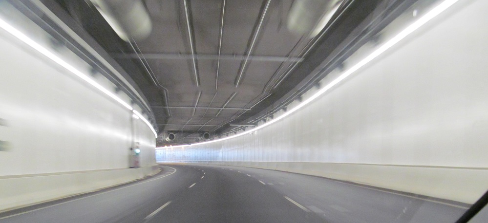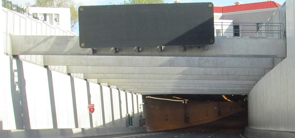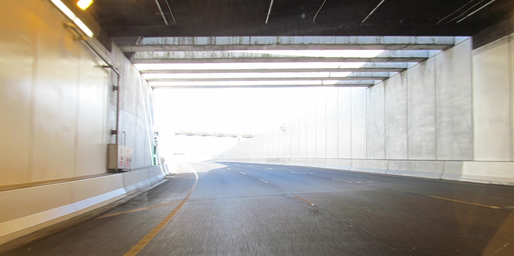I can see the Auckland Harbour Bridge, but before I can cross the bridge, I must first go through a tunnel. The four original freeway lanes elevated above Victoria Park now are all dedicated to SB traffic, with the old SB side leading to NZ 16 and the old NB side now the NZ 1 SB through lanes. In order to not further disturb the park, the new 3 NB lanes are underneath.