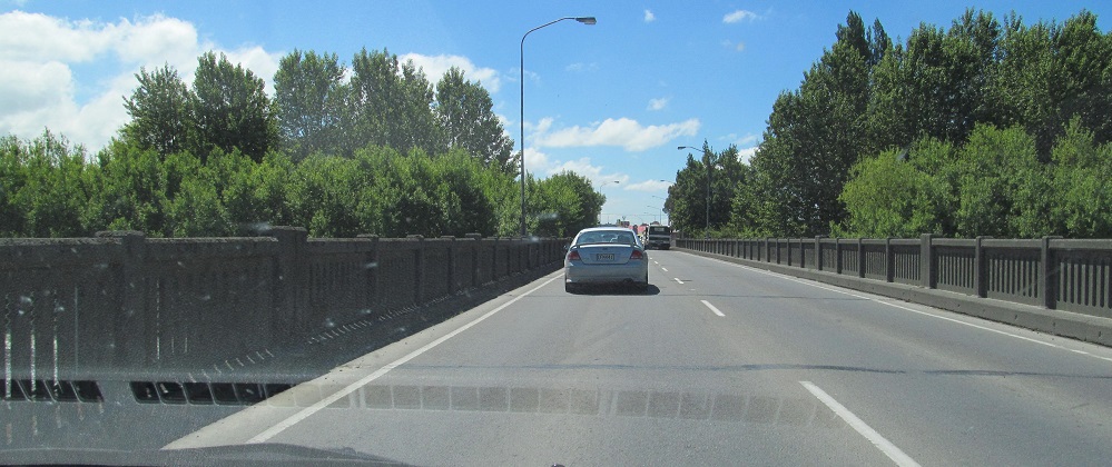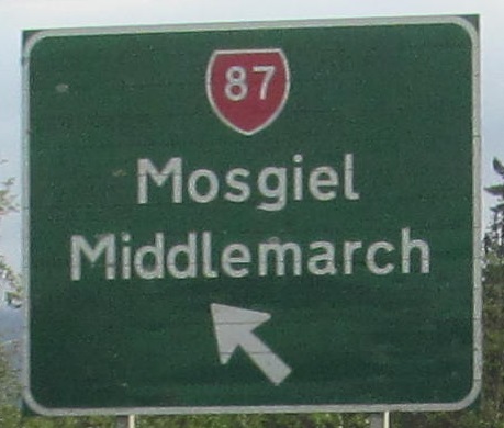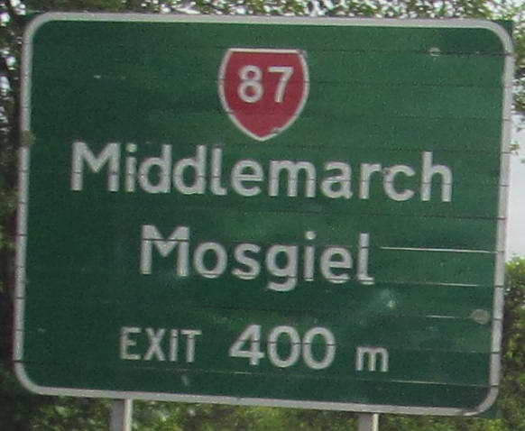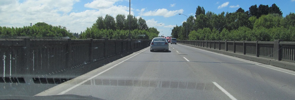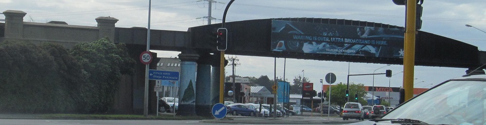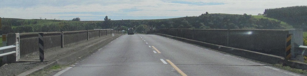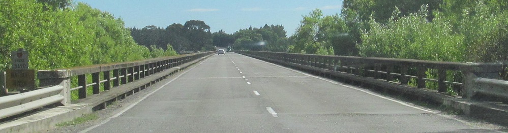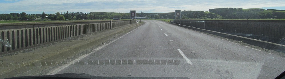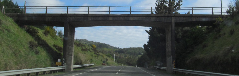 NZ 1 becomes the Northern Motorway for a brief stretch after Dunedin, but it's just a super-2. This overpass is Dryden Rd. I was probably passing someone as I took this photo.
