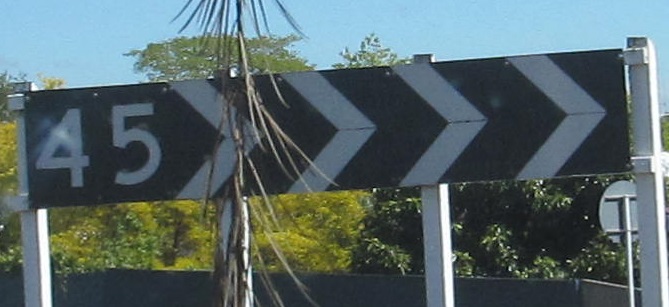 Old curve sign at White St. in Timaru, the same city as this page's header photo. New Zealand now uses black on yellow.