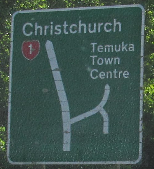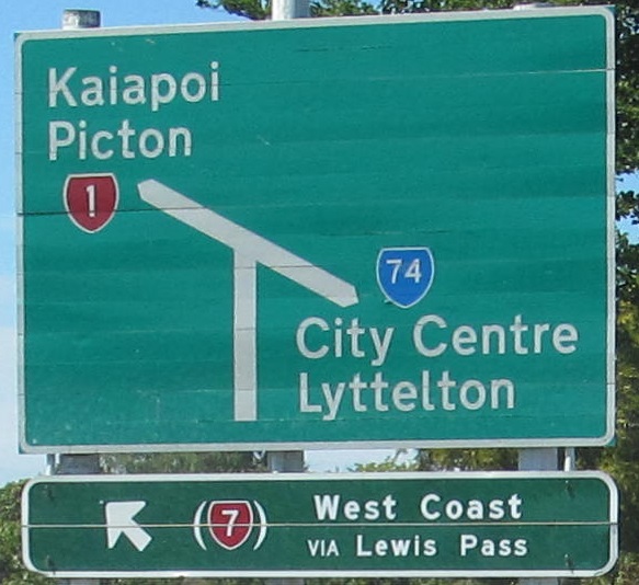 Extension of the bypass also means NZ 74 is extended north along old NZ 1 to meet it, which means that this old NB sign is now inaccurate and long gone. It was on what's now just Johns Rd. Until some point in the distant past, NZ had a classification system of primary and secondary routes, where the secondaries (all of the 2-digit routes that branch off of their 1-digit parents) were signed with blue shields instead of red. NZ 74 is still a branch of NZ 7, but now all routes get the same red shield. Incidentally, if NZ 1 originally went straight into Christchurch as I suspect, the first 4 km of NZ 74 to the right is along original NZ 1.