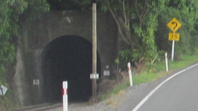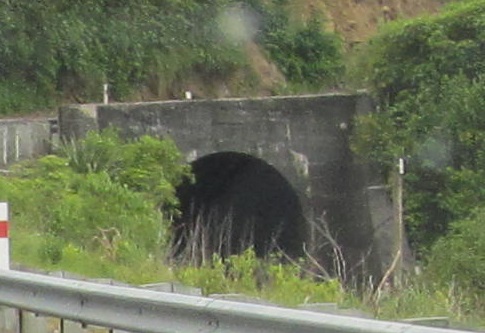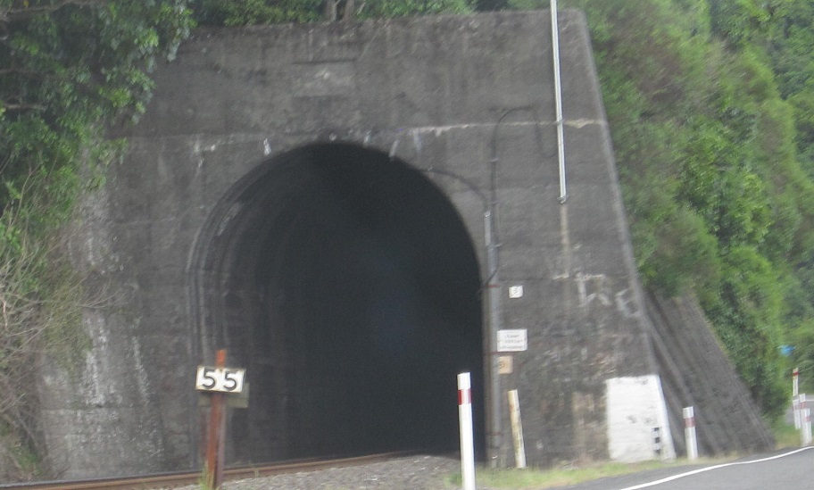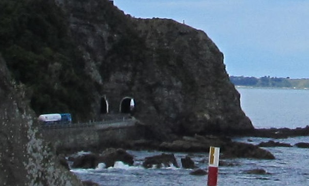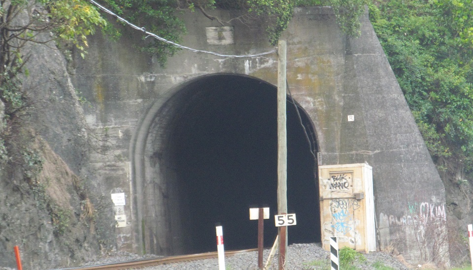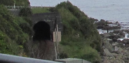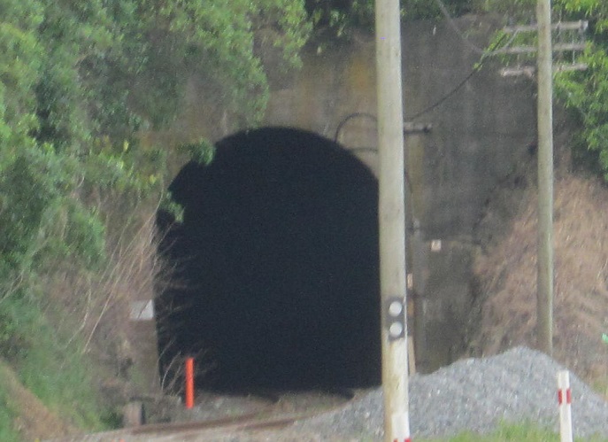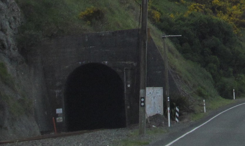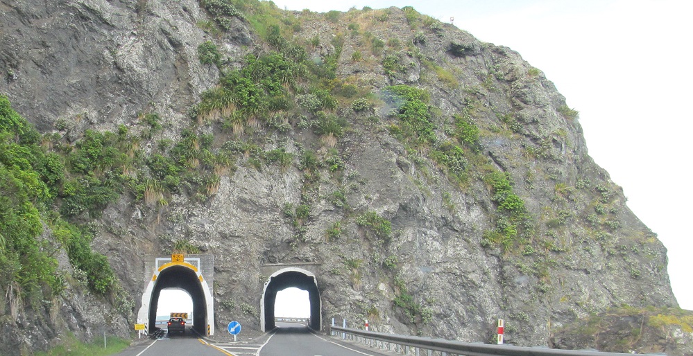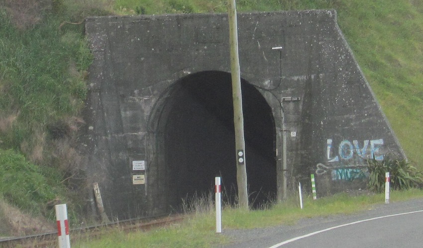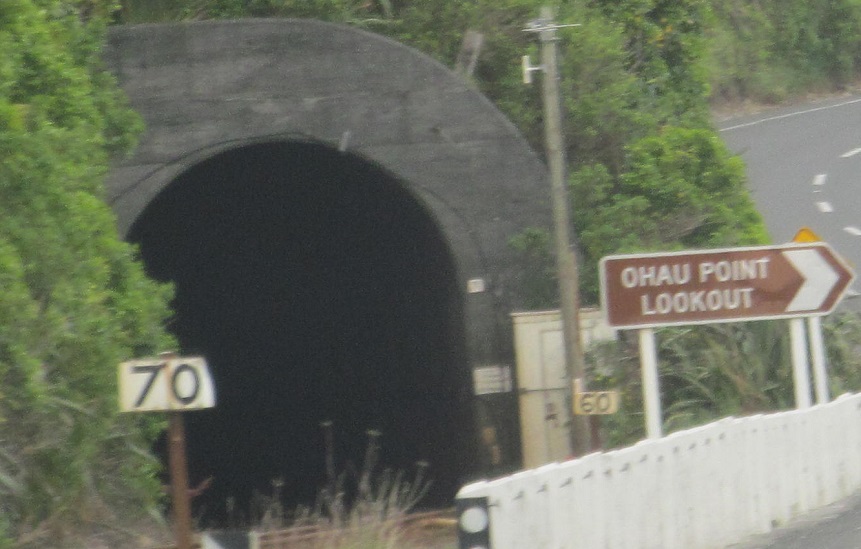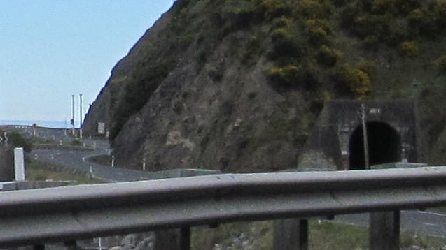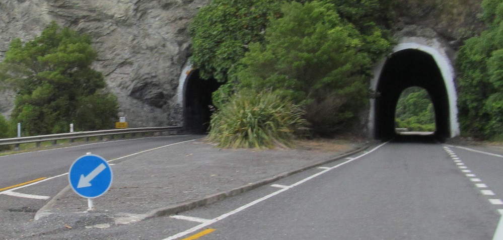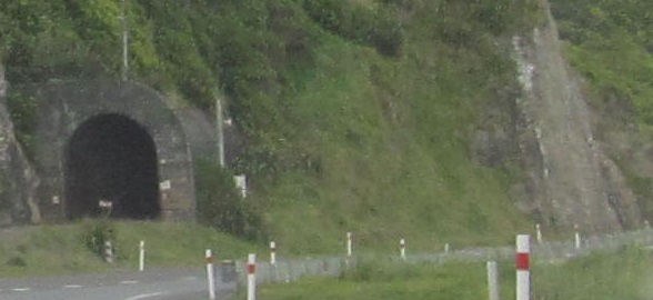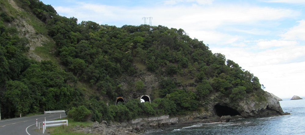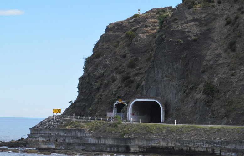 NZ 1 enters a long coastal stretch from Oaro to Kaikoura. As the road winds around the hills north of the Hawkswood Range, the railroad does not have the same flexibility and runs through a series of tunnels. There are two along NZ 1. The first, pictured here with a last look back south, are the Raramai Tunnels. NB is Tunnel #2 and SB is Tunnel #1.
