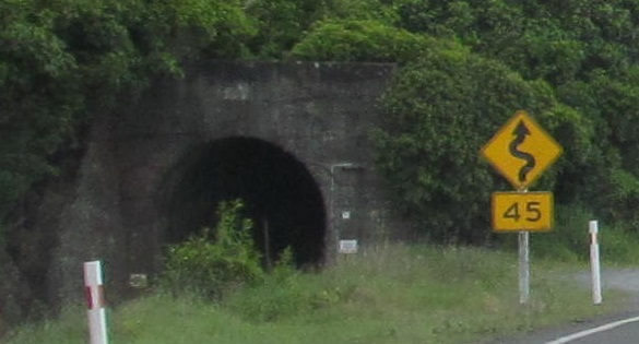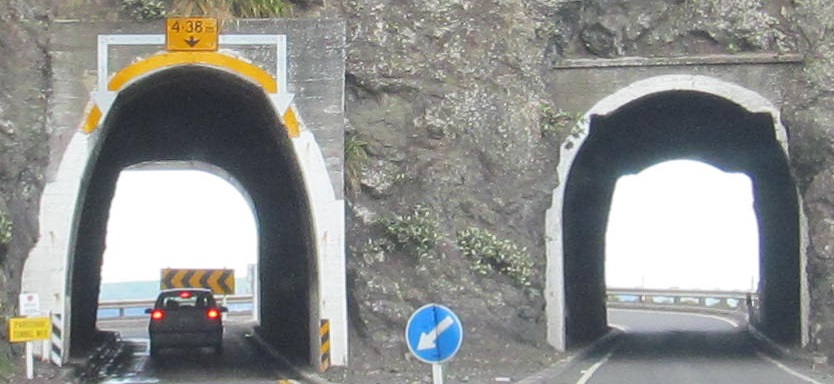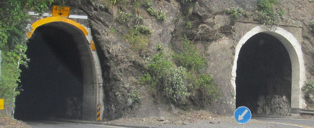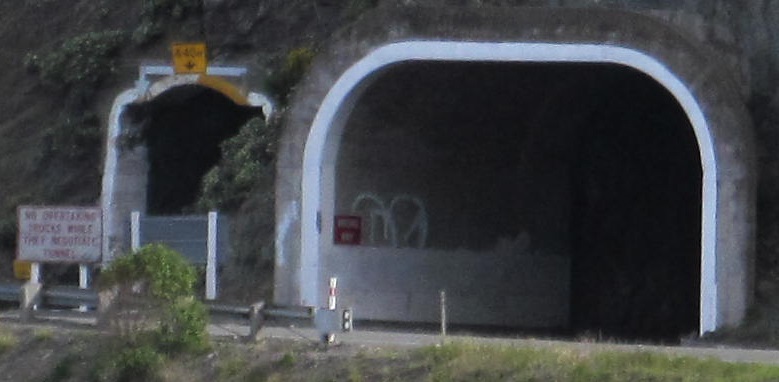Winding my way to the second road tunnel, Parititahi, with the same division of SB #1 and NB #2. At least in this case, #1 was also the first to be built, which is very obvious from the two southward-facing photos. New Zealand had to come back and square the top of the tunnel so trucks could get through, and post a warning not to overtake trucks while they negotiate the tunnel (not necessary for the wider NB bore).