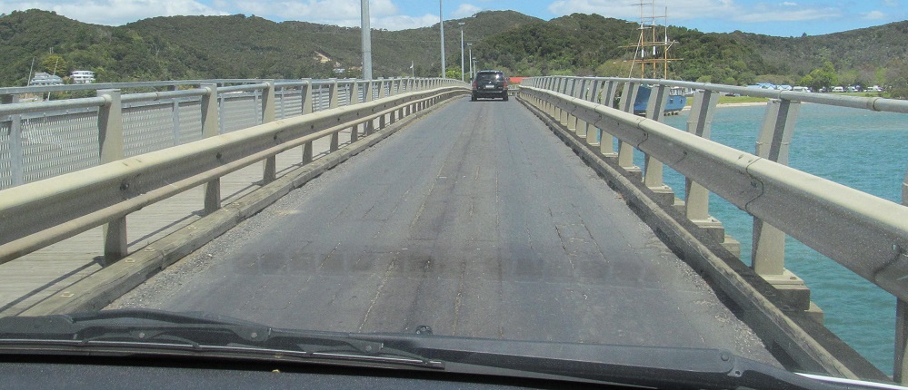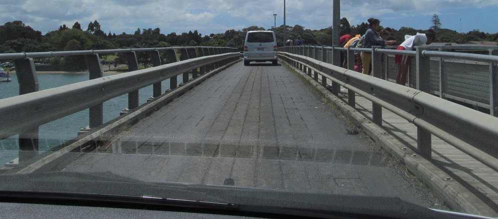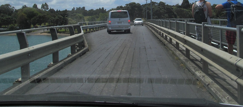 Waitangi Bridge is an old, long, one-lane, wooden bridge across the eponymous river. The forward-thinking engineers left passing pullouts at convenient intervals. Because they're on the left as I cross northward from Te Karuwha Parade in Paihia, NB traffic is always expected to yield to SB.