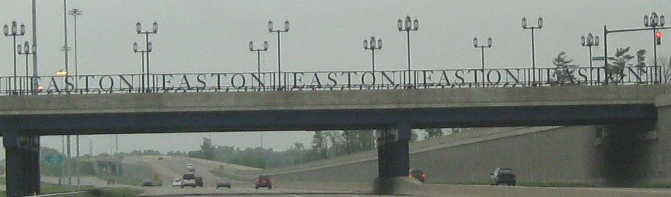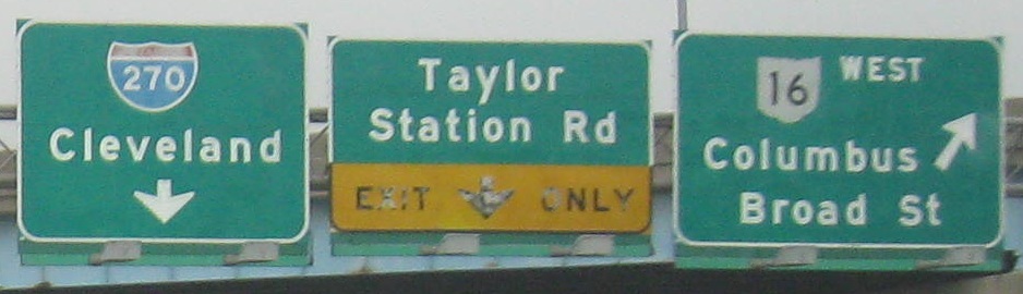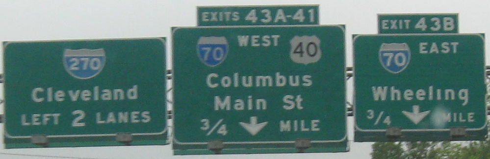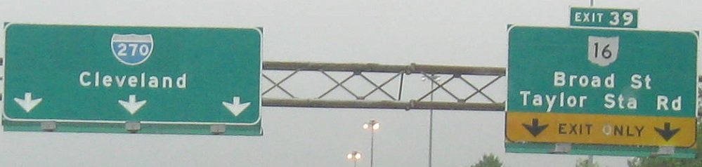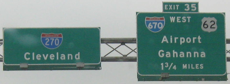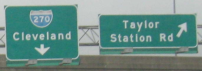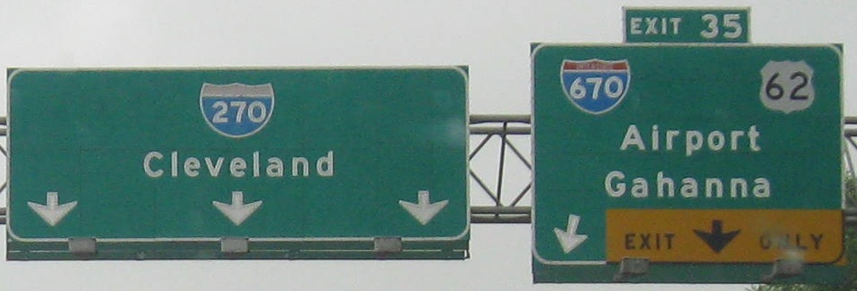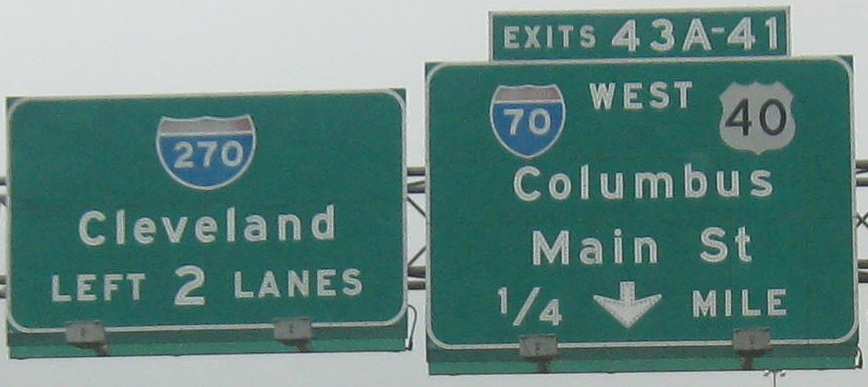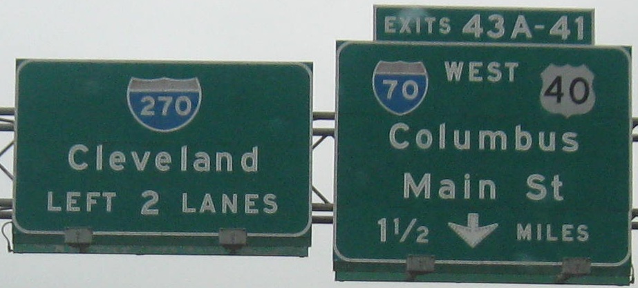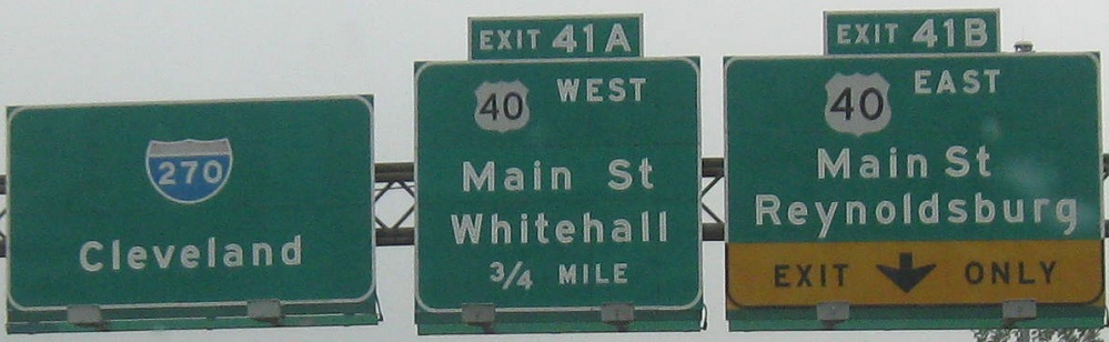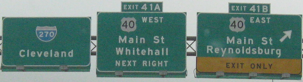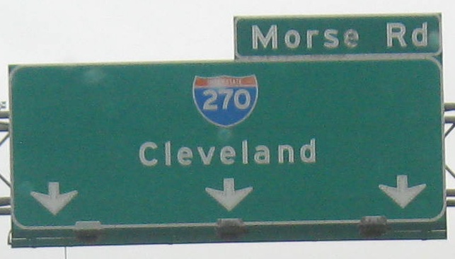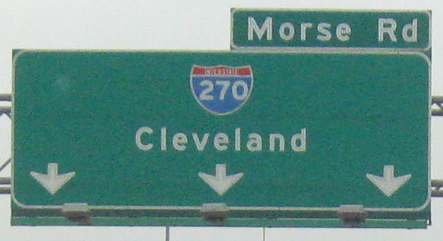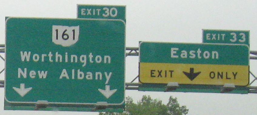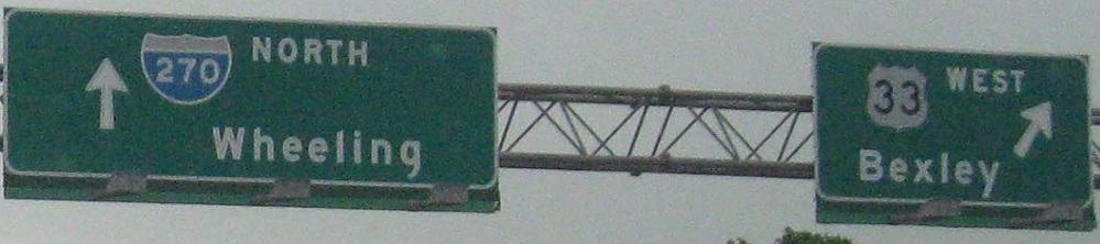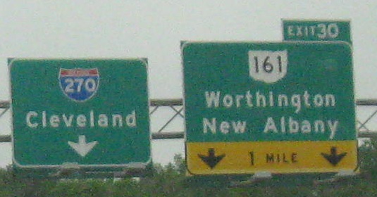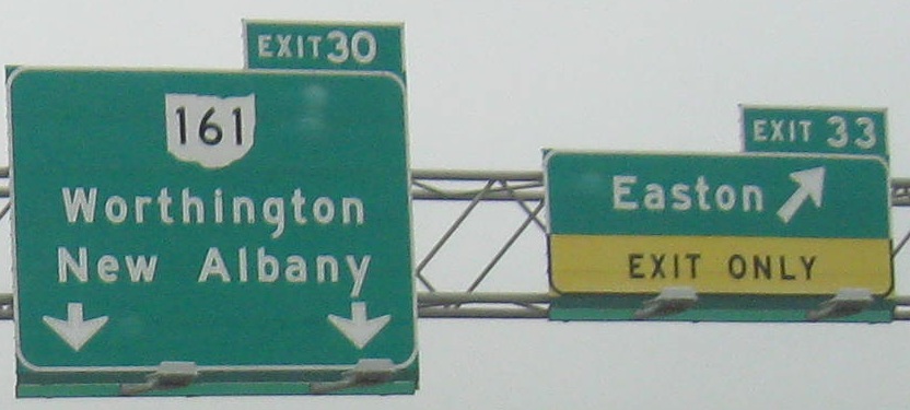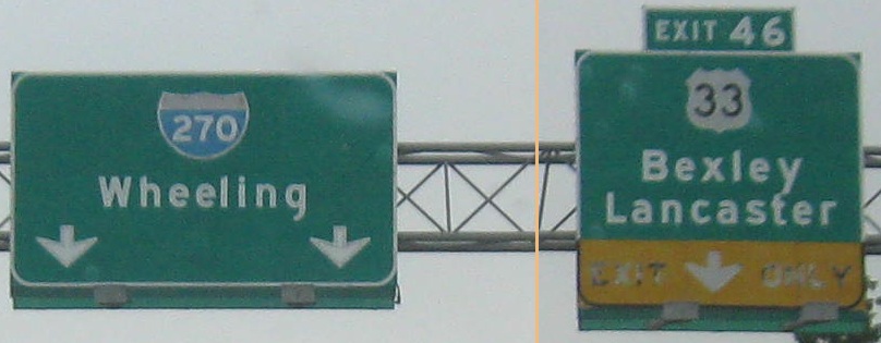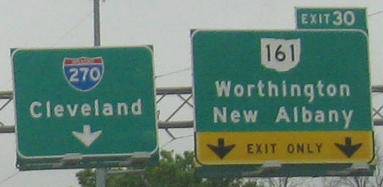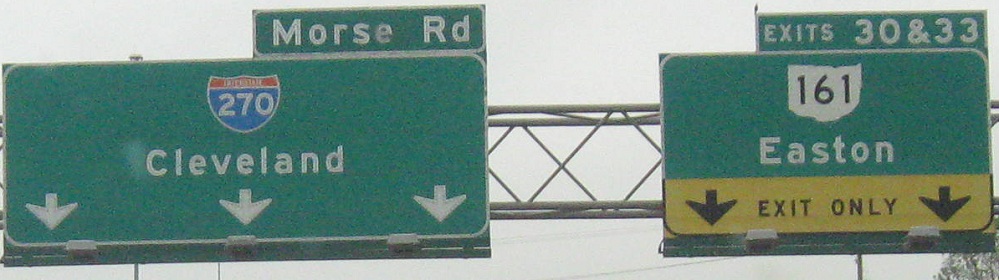 If it says Exit 32, it's on the mainline. If it says Exit 33 or Exit 30, it's on the C-D road. That, and the last two photos are on the left and right sides of the same gantry (all over the mainline). This is a confusing area, obviously Easton (and that's the Easton Way overpass), which is really part of Columbus; Easton is just the name of the nearby mall. The NB exit for OH 161 EB flies over and around the Exit 32 diamond interchange, also taking Exit 33A traffic from Easton Way, and gives Easton Way traffic one chance to get back on I-270 before leaving for OH 161. That means that Easton Way can't use I-270 to get to Morse Rd., nor can Morse Rd. get to OH 161 EB. The SB side is similar, preventing OH 161 EB from accessing Morse Rd. and Morse Rd. from accessing Easton Way. The interchange spacing looks more than adequate to abandon this setup and just go with a standard, full-access freeway. Apparently (thanks to Sandor Gulyas for the information), as the more cynical may have guessed based on the self-importance of placing a mall name on an overpass railing, the reason was political on behalf of the Easton Way interchange and associated Easton development.