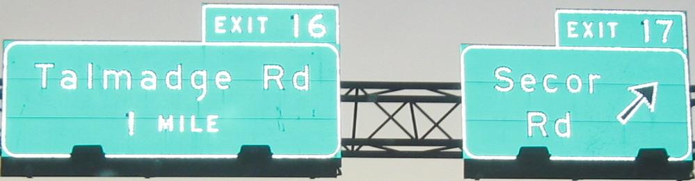 Most of the SB button copy on I-475/US 23, up to the junction of consecutively numbered US 23 and 24. Because I-475 is newer than the Turnpike, the interchange remains at US 20 just over a mile to the east. Since I-475 was constructed, development has filled in to prevent that situation from being rectified.