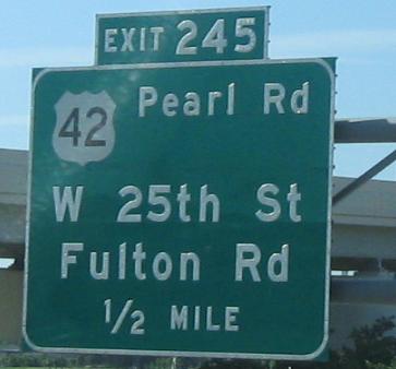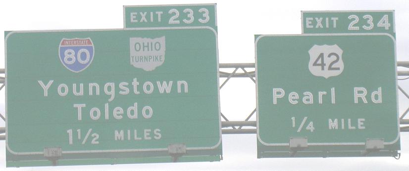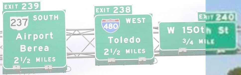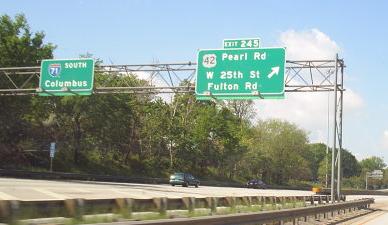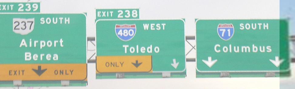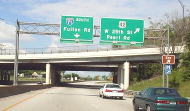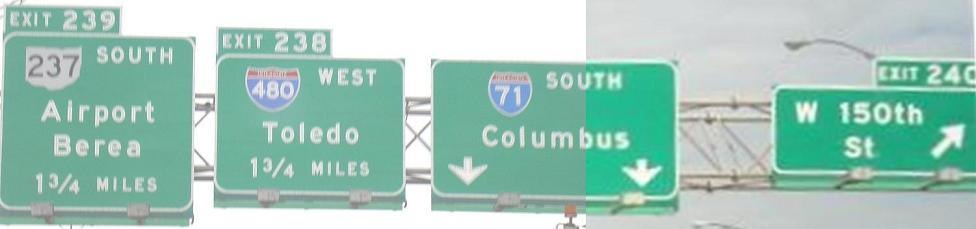 Obviously, the last couple of photos are heading down the ramp away from I-71 SB. There is no SB-EB or WB-NB access here - one must use OH 176 or I-77 (or, for the poor planners, W. 130th or W. 150th Streets). The three smaller photos are courtesy Doug Kerr. The last two are courtesy John Krakoff, and the others are hybrids of the two.