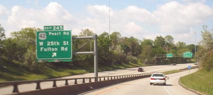 Starting from the top of the Interstate, the first three photos are mine, and the remainder are courtesy Doug Kerr while entering from W. 14th St. in Cleveland. That onramp merges with the Exit 245 ramp to become a C-D road for a little while before joining the freeway proper after the last photo. US 42 parallels I-71 all the way through Ohio, one of the only even/odd pairs of Interstate and US highways in the nation (US 67/I-30 is the only other one that springs to mind).