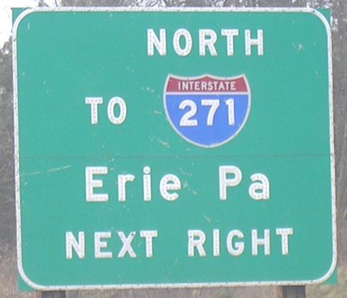 The third (smaller) photo is courtesy Doug Kerr and the 2nd, 4th, and 5th are courtesy John Krakoff. I-271 from this direction is reached via OH 3, but I don't think Erie Pa. makes much sense as a destination for traffic that's already heading southbound. Perhaps one of the southeastern suburbs of Cleveland would suffice.