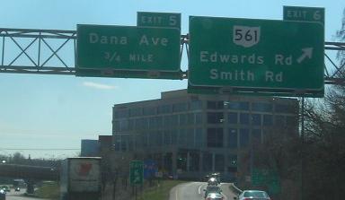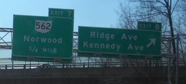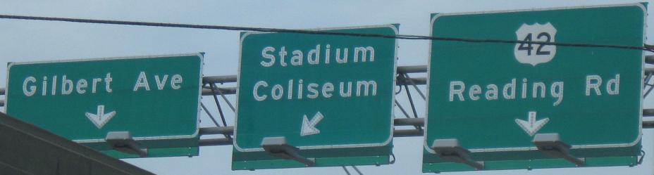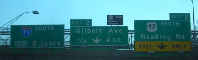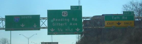 All courtesy Doug Kerr, in Cincinnati. Note the narrow exit gore sign for Exit 6 (but look, there's plenty of room there for a standard one) and how exit numbers start disappearing at the end of the freeway.
