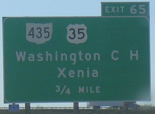 The last photo is on the Exit 65 ramp; the first three photos are courtesy John Krakoff and the last is courtesy Doug Kerr. OH 435 used to be US 35 until quite recently, but 35 now follows a freeway from Xenia to Chillicothe. As you see, the advance exit signs that aren't even button copy still haven't caught up completely.
