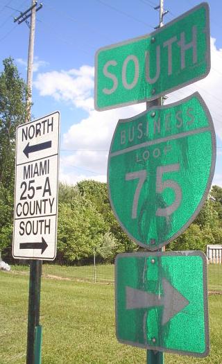Plenty of southbound photos, all courtesy Doug Kerr, continuing off the Exit 83 ramp to a very old (original?) Business Loop shield and arrow. CR 25A gets top billing here and BL 75 is barely mentioned, but the number 25 has been around much longer - the Dixie Highway was originally US 25 (to OH 66 to US 33 to Indianapolis, north of Piqua). Sadly, although so much of the original road remains up through Ohio, US 25 has been truncated all the way down to Kentucky.
