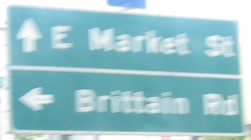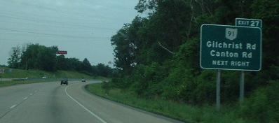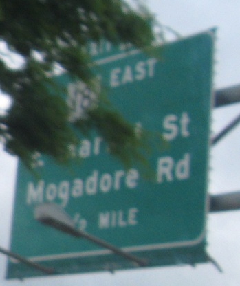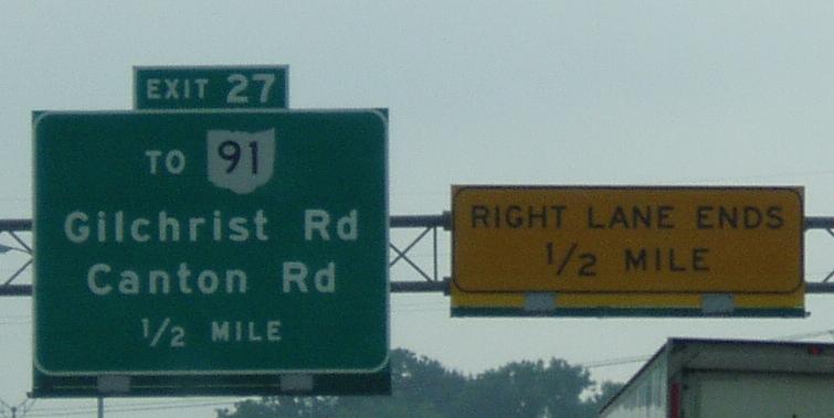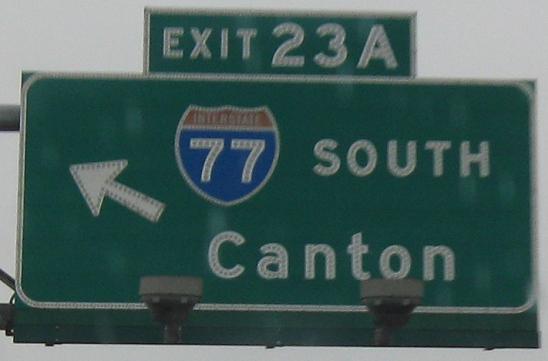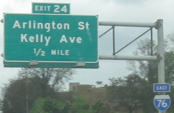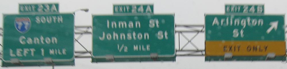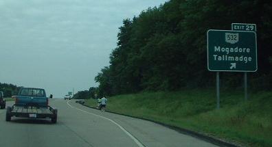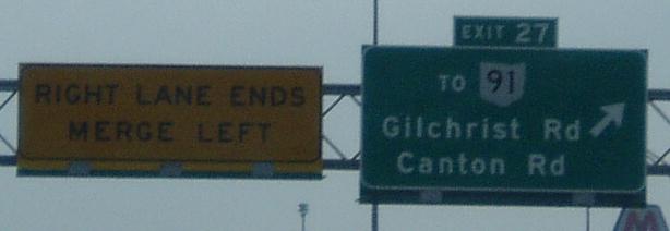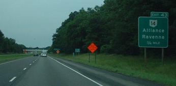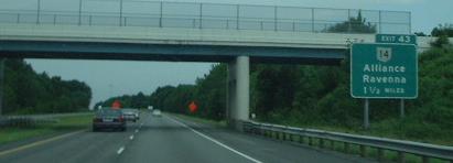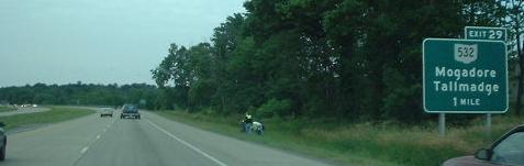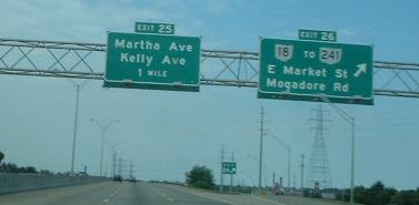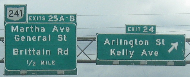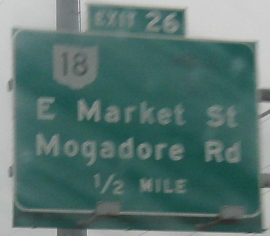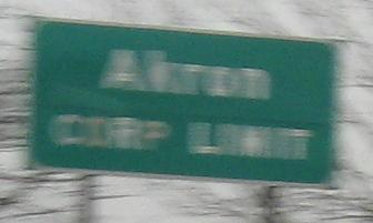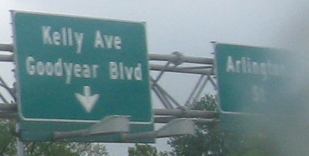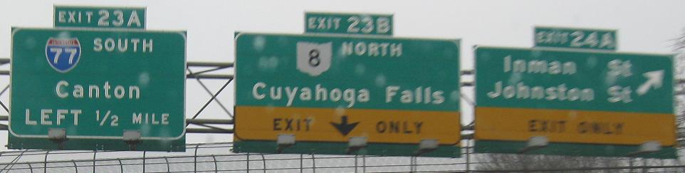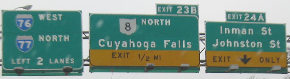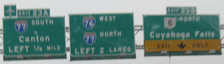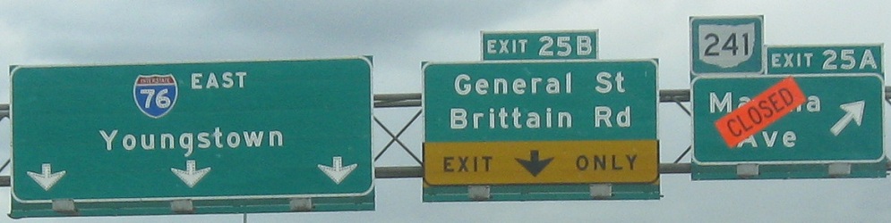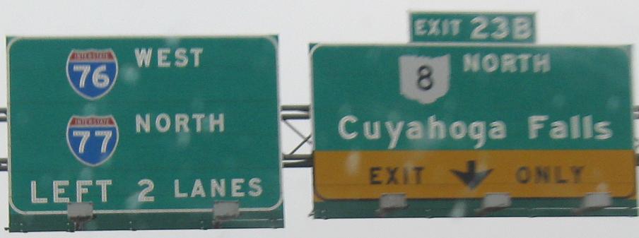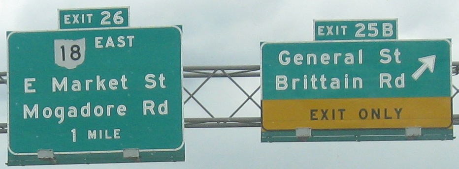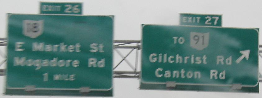 Westbound heading into Akron, first three photos courtesy Doug Kerr. Notice that in the last photo, there's an addition to the left sign and blank space on the right sign. They're related. Click on it for the previous look of the assembly, also courtesy Doug.